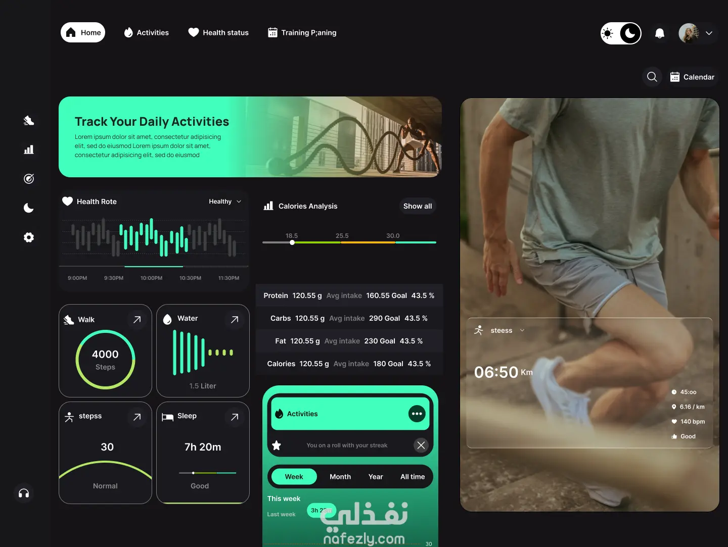 في هذا المشروع قمت بتصميم واجهة Dashboard لتطبيق لياقة بدنية تساعد المستخدم على متابعة نشاطه الصحي اليومي مثل عدد الخطوات والسعرات الحرارية ومعدل ضربات القلب والنوم واستهلاك الماء.