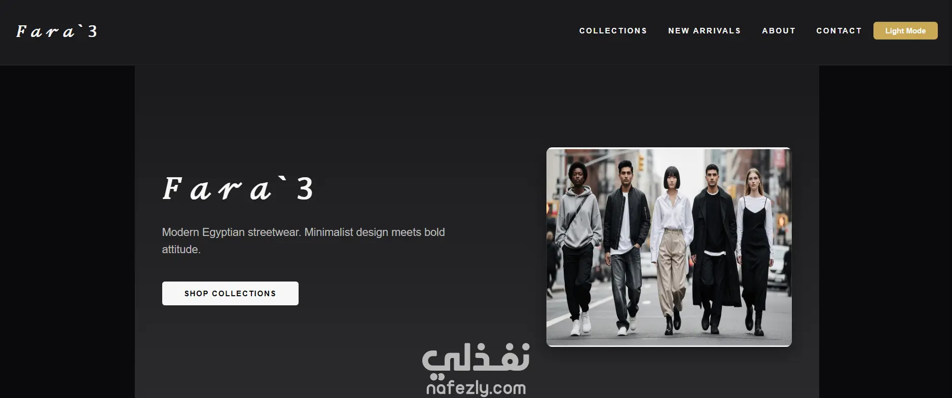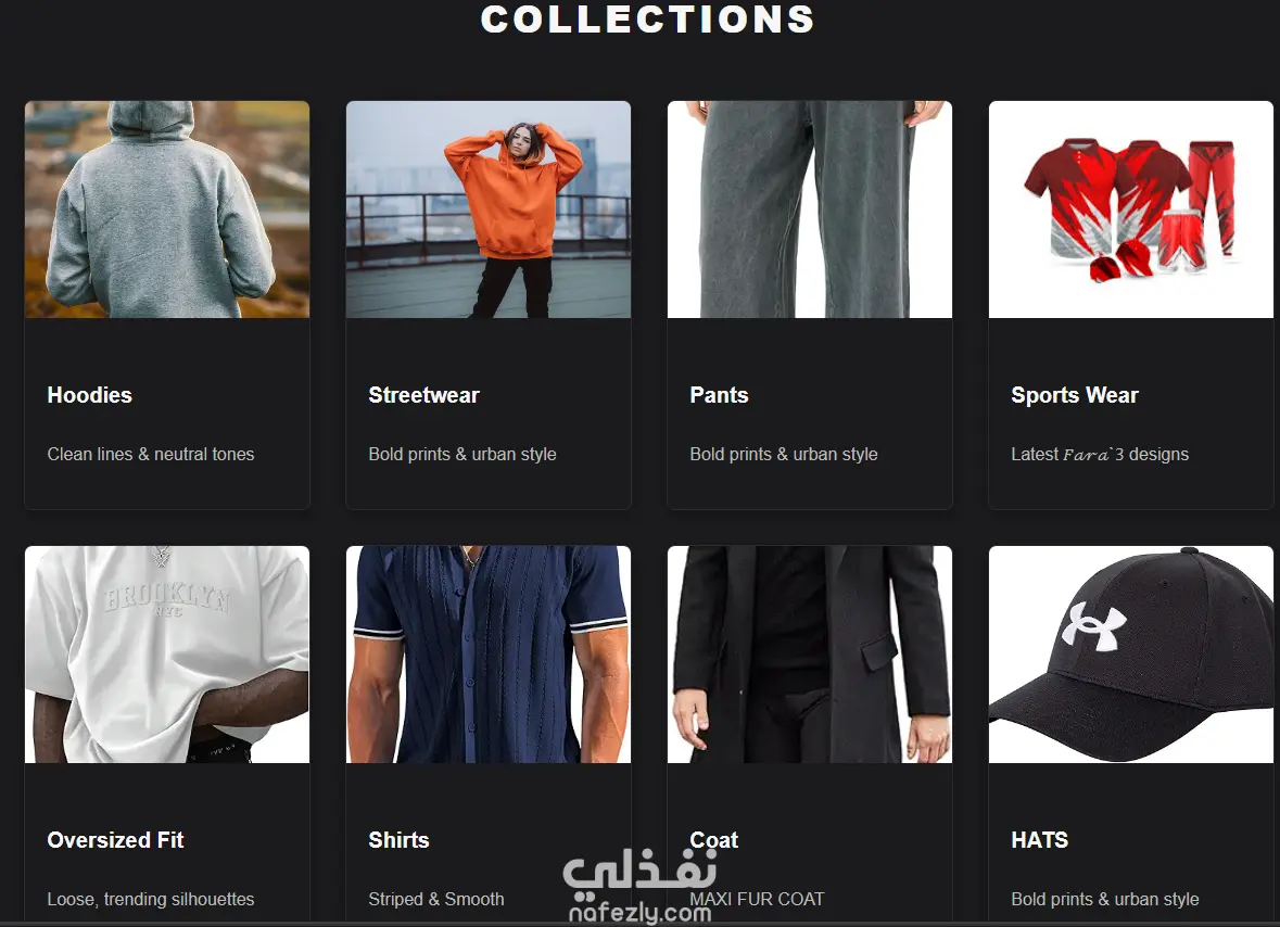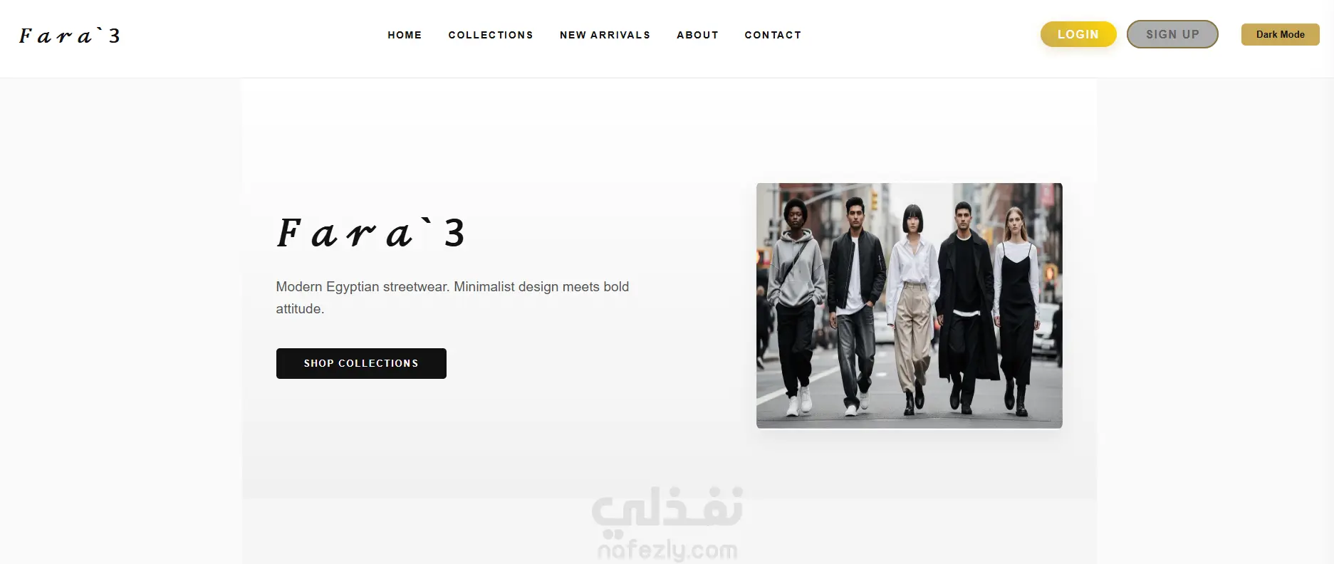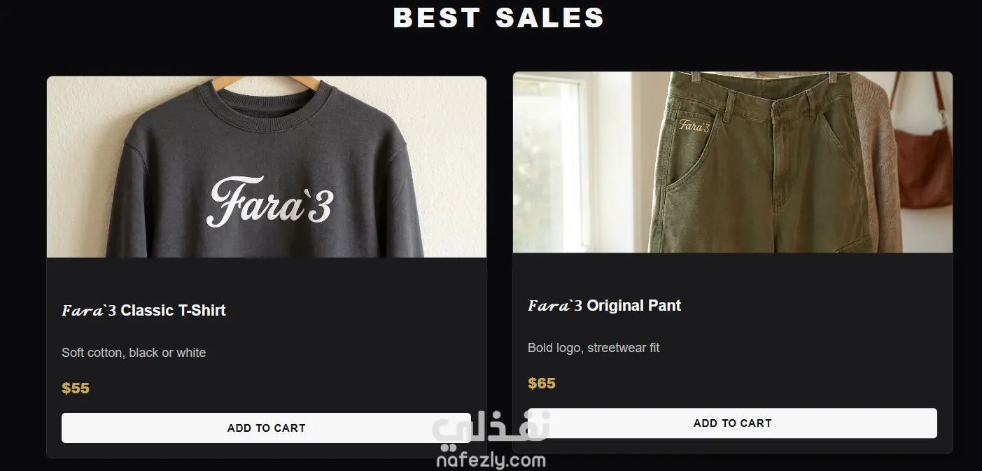 قمت بتصميم وتطوير موقع إلكتروني متكامل لبراند ملابس محلي مصري باسم Fara3 باستخدام HTML وCSS وJavaScript وJQuery. يتضمن الموقع صفحة رئيسية بتأثيرات Parallax وأنيميشن، وقسم Collections يعرض تشكيلات الملابس المختلفة كالهوديز والسترويت وير والبناطيل والأحذية، وقسم منتجات مع نظام سلة تسوق كامل، ونظام Checkout مع خيارات دفع متعددة. كما يحتوي على Dark Mode، وقائمة جانبية للموبايل، وقسم تواصل، مع دعم بيانات XML وJSON لعرض المنتجات ديناميكياً.