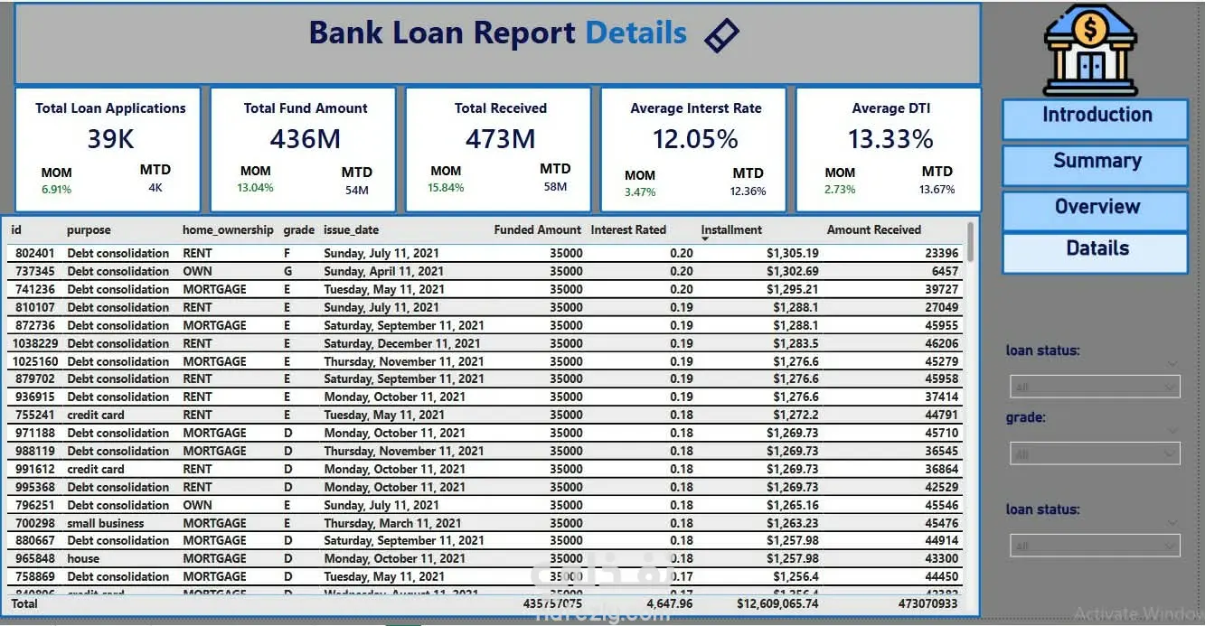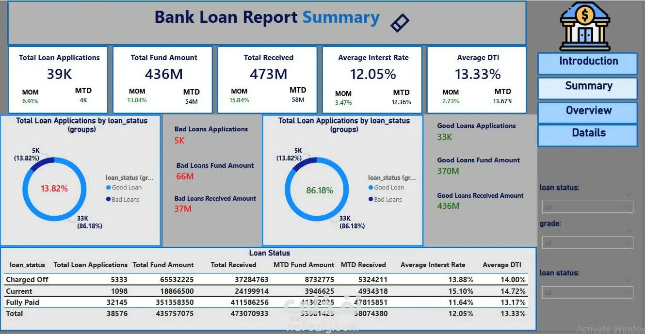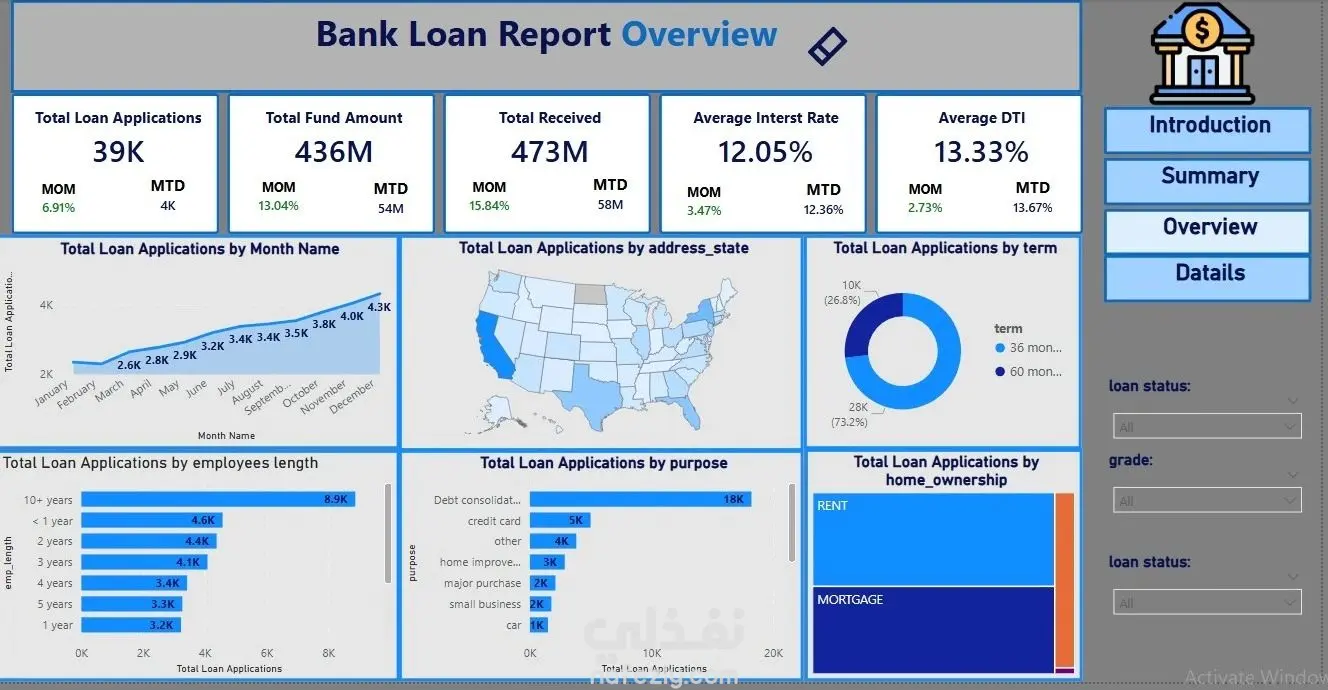 قمت بتحليل بيانات القروض البنكية باستخدام Power BI بهدف فهم أداء القروض وتقييم جودة المحفظة الائتمانية و ايضا data modeling . و من اهم النتائج : 📊📉 اجمالى طلبات القروض : ٣٩ ألف طلب اجمالى قيمة التمويل : ٤٣٦ مليون دولار اجمالى المبالغ المستلمه: ٤٧٣ مليون دولار متوسط سعر الفائدة : ١٢.٠٥% متوسط نسبة (DTI) او debit to income ratio: ١٣.٣٣% أظهر التحليل نموًا شهريًا في الطلب على القروض، حيث زادت طلبات القروض بنسبة حوالى 6.9% و من اهم الملاحظات : 💡 ١. هناك بنسبة ٨٦% مصنفة من القروض الجيدة مقابل حوالى ١٦% قروض متعثرة ٢. معظم العملاء يفصلون قروض لمدة ٣٦ شهر ٣. اكثر سبب شيوعا فى طلب القروض هو تجميع الديون ٤. العملاء ذو خبرة اكثر من ١٠ سنوات هم اكثر طلبا القروض ٥. اكثر ولايه طلبات للقروض هو ولايت كاليفورنيا