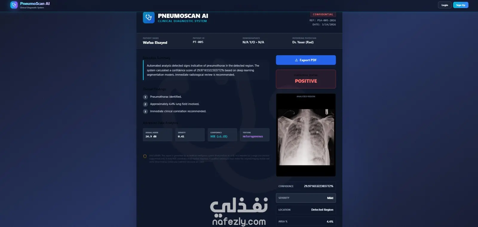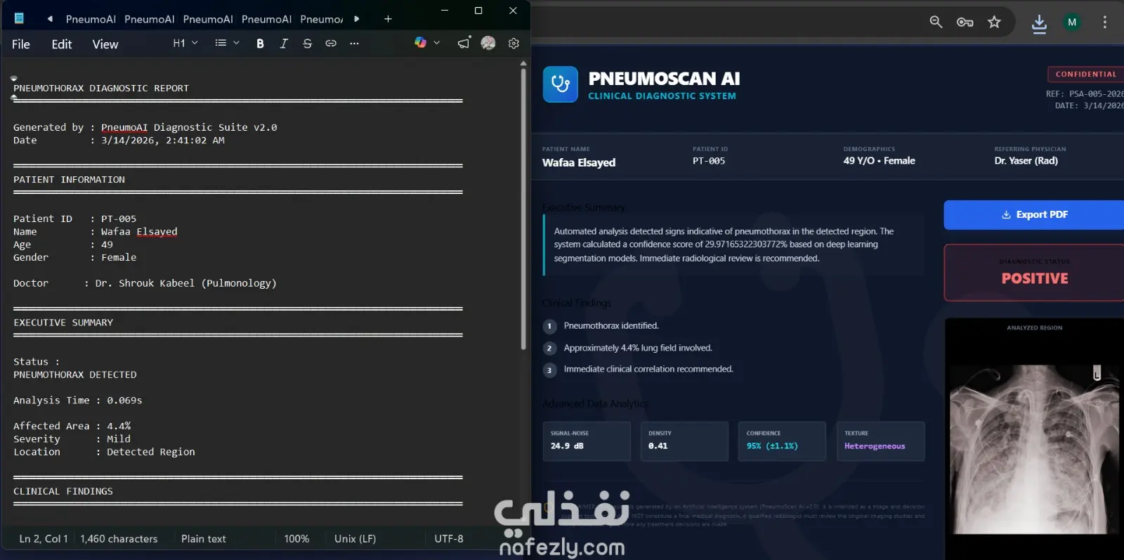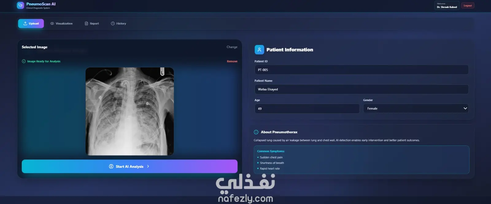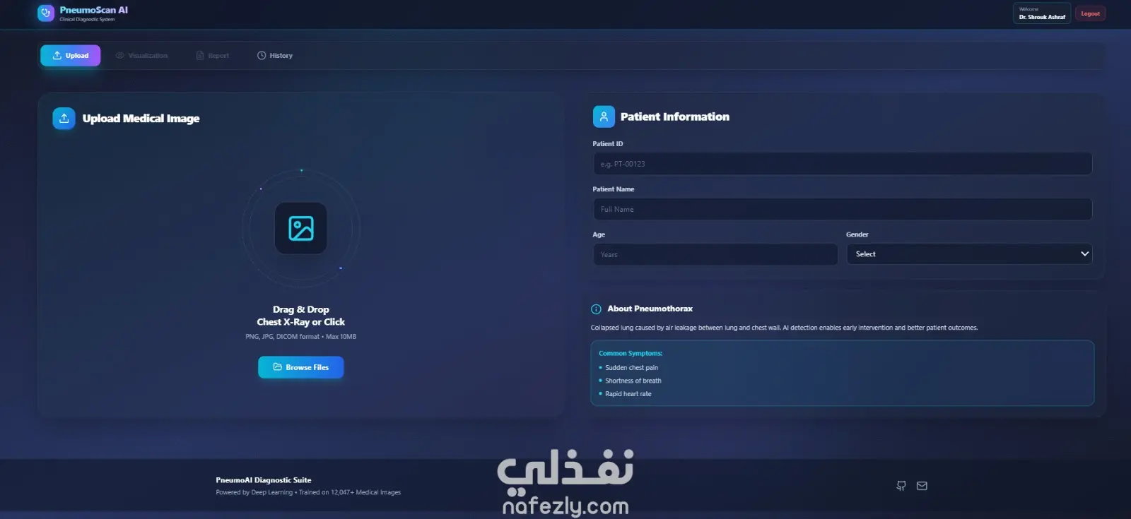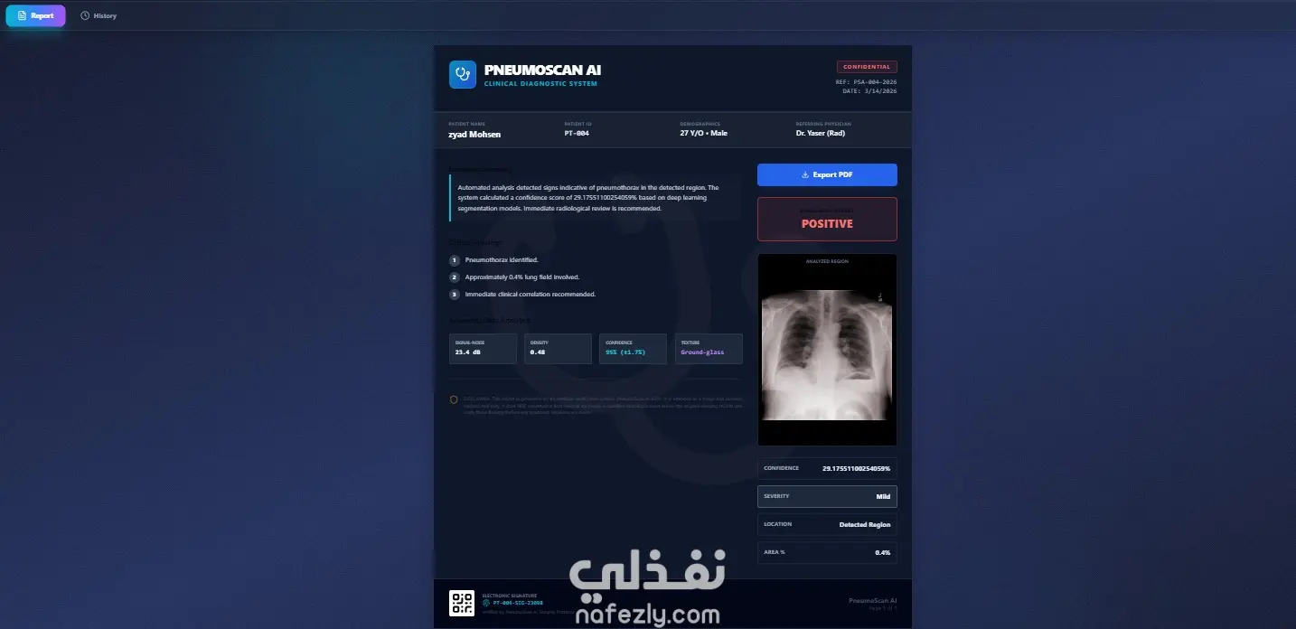 مشروع PneumoScan AI هو تطبيق ويب متكامل (End-to-End) يعتمد على التعلم العميق (Deep Learning) لتشخيص واكتشاف "استرواح الصدر" (Pneumothorax) من خلال صور الأشعة السينية (X-rays) بدقة طبية عالية.