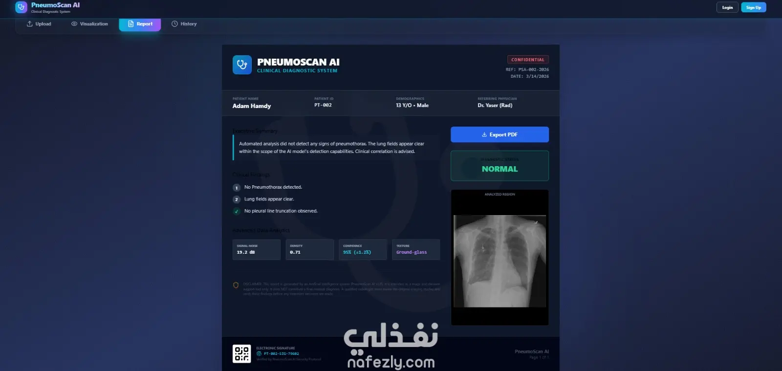 هذا المسار القوي للبيانات أدى إلى تدريب نموذج عالي الدقة، تم ربطه لاحقاً بواجهة مستخدم تفاعلية (React + FastAPI) تتيح للأطباء استخراج تقارير طبية فورية بصيغة PDF.