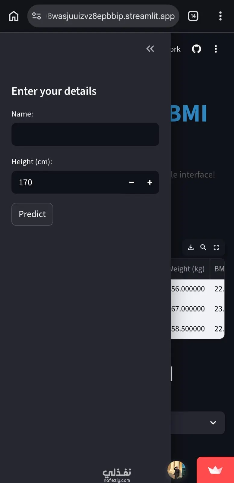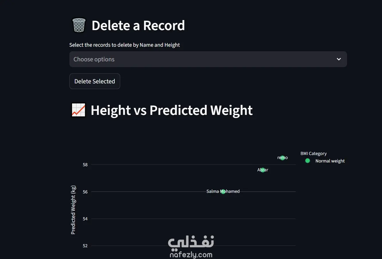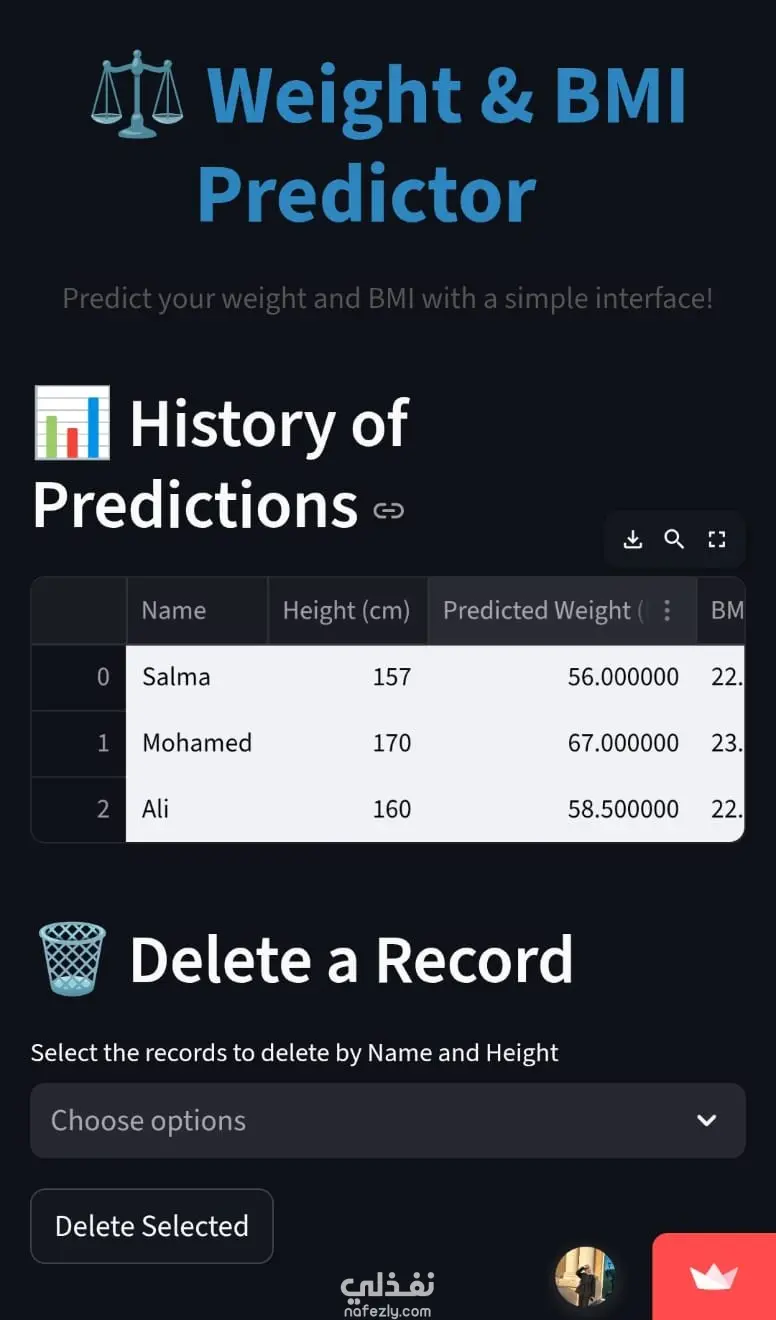 هذا المشروع عبارة عن تطبيق تفاعلي مبني باستخدام Python و Streamlit للتنبؤ بالوزن ومؤشر كتلة الجسم BMI اعتمادًا على الطول. يتيح التطبيق للمستخدم إدخال بياناته مثل الاسم والطول، ثم يقوم النظام بحساب الوزن المتوقع بالإضافة إلى حساب مؤشر كتلة الجسم وتصنيفه. كما يوفر التطبيق واجهة سهلة الاستخدام لعرض سجل التوقعات السابقة، وإمكانية حذف أي سجل، بالإضافة إلى رسم بياني يوضح العلاقة بين الطول والوزن المتوقع لتحليل البيانات بشكل بصري. يهدف المشروع إلى توضيح كيفية تطبيق تقنيات تحليل البيانات و Machine Learning لإنشاء تطبيق تفاعلي بسيط وسهل الاستخدام.