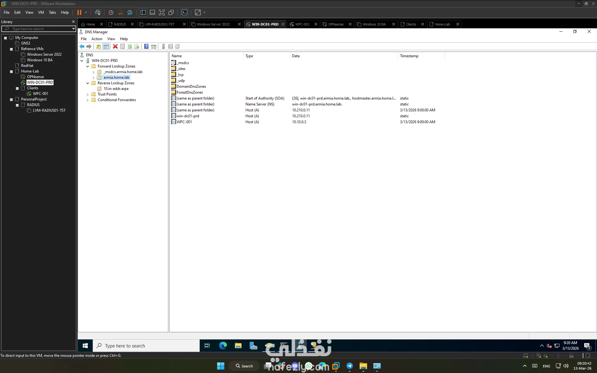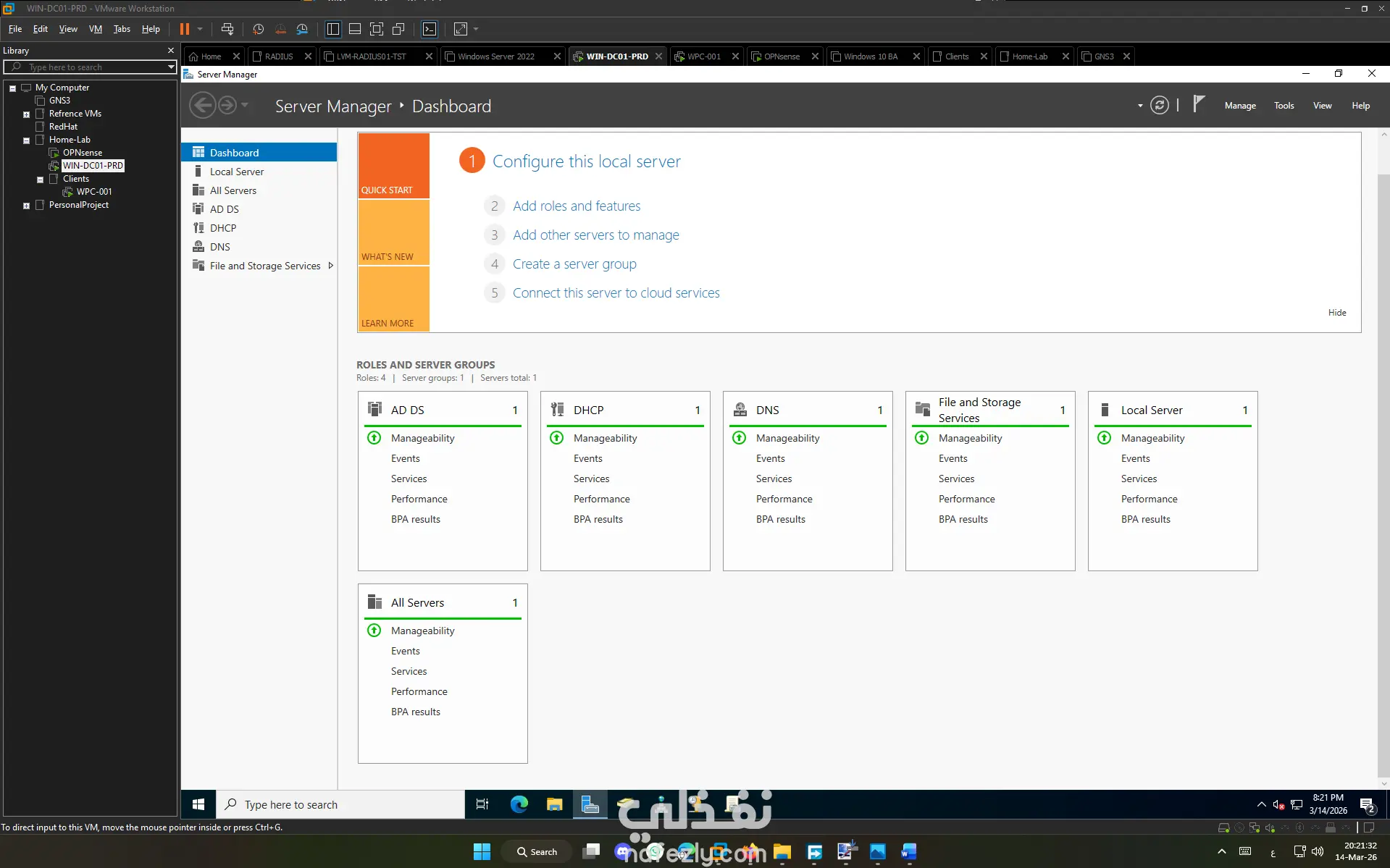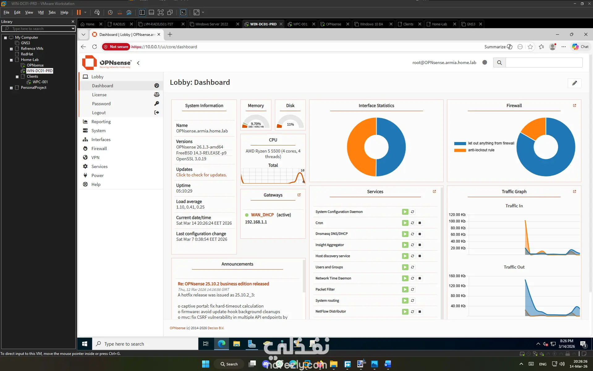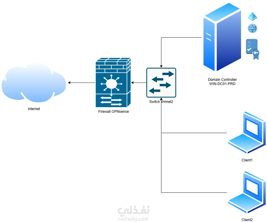 تم تثبيت Windows Server 2022 و Windows 10 Enterprise و OPNsense لهذا المشروع على VMware Workstation Pro v17.5 النظام موجود داخل شبكة انترنت معزولة ، تتصل بالانترنت فقط عن طريق الfirewall OPNsense بهذا النظام ، يقوم السيرفر بدور الdomain controller الأساسي ، بالاضافة إلى خدمات اخرى مثل DNS, DHCP كما موضح بصور البروجكت. بهذا تم