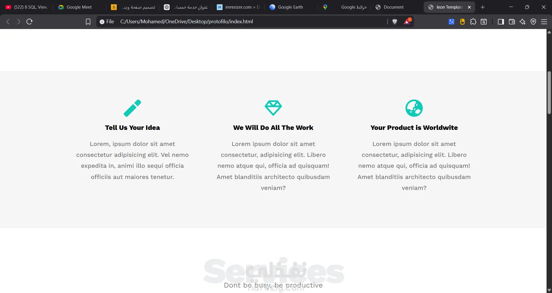 إذا كان لديك تصميم وتريد تحويله إلى موقع حقيقي، أو تريد إنشاء واجهة موقع جديدة وجذابة، يمكنني تنفيذ ذلك باستخدام أحدث تقنيات الويبأقدم لك خدمة تصميم وبرمجة واجهات مواقع احترافية (Front-End) بشكل عصري ومتجاوب مع جميع الأجهزة مثل الموبايل والتابلت والكمبيوتر.