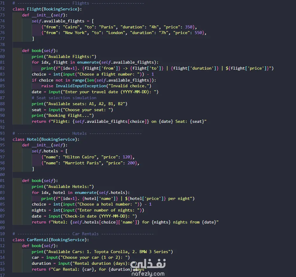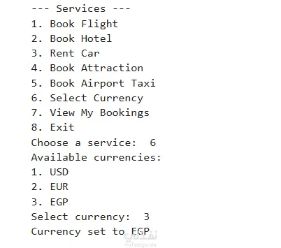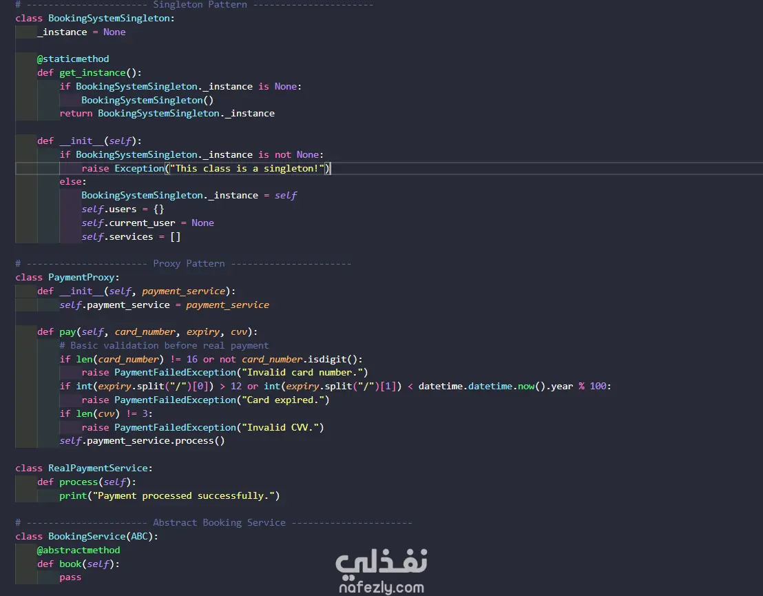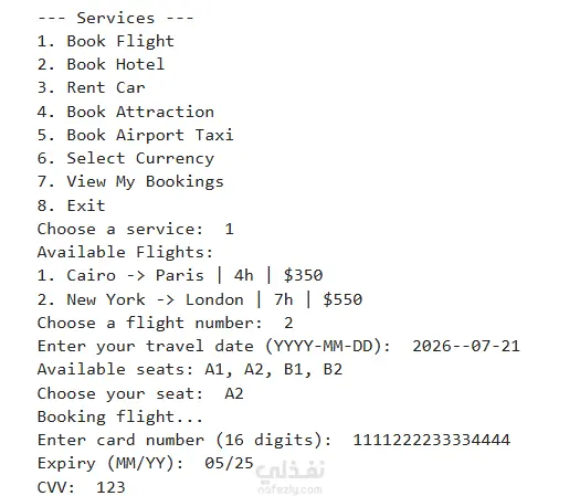 قمت بتطوير نظام حجز طيران متكامل باستخدام Python في مادة Advanced Programming ، يتيح للمستخدم التسجيل وتسجيل الدخول، وحجز رحلات طيران وفنادق وسيارات ومعالم سياحية وتاكسي المطار، مع نظام دفع إلكتروني. تم بناء المشروع باستخدام عدة مفاهيم وأنماط برمجية احترافية منها: نمط Singleton لضمان وجود نسخة واحدة من النظام، ونمط Proxy للتحقق من بيانات الدفع قبل المعالجة، والبرمجة الكائنية (OOP) مع الاستخدام الكامل للتجريد (Abstract Classes) والوراثة والتعامل مع الاستثناءات (Exception Handling).