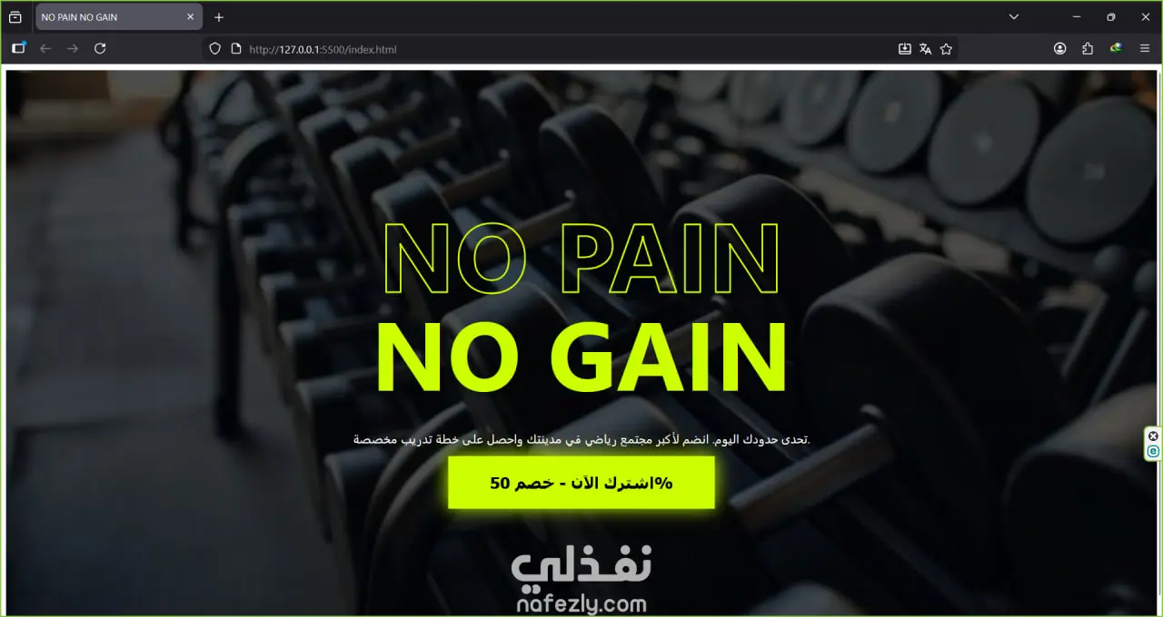 A powerful Hero Section featuring a motivational slogan like “NO PAIN NO GAIN”.