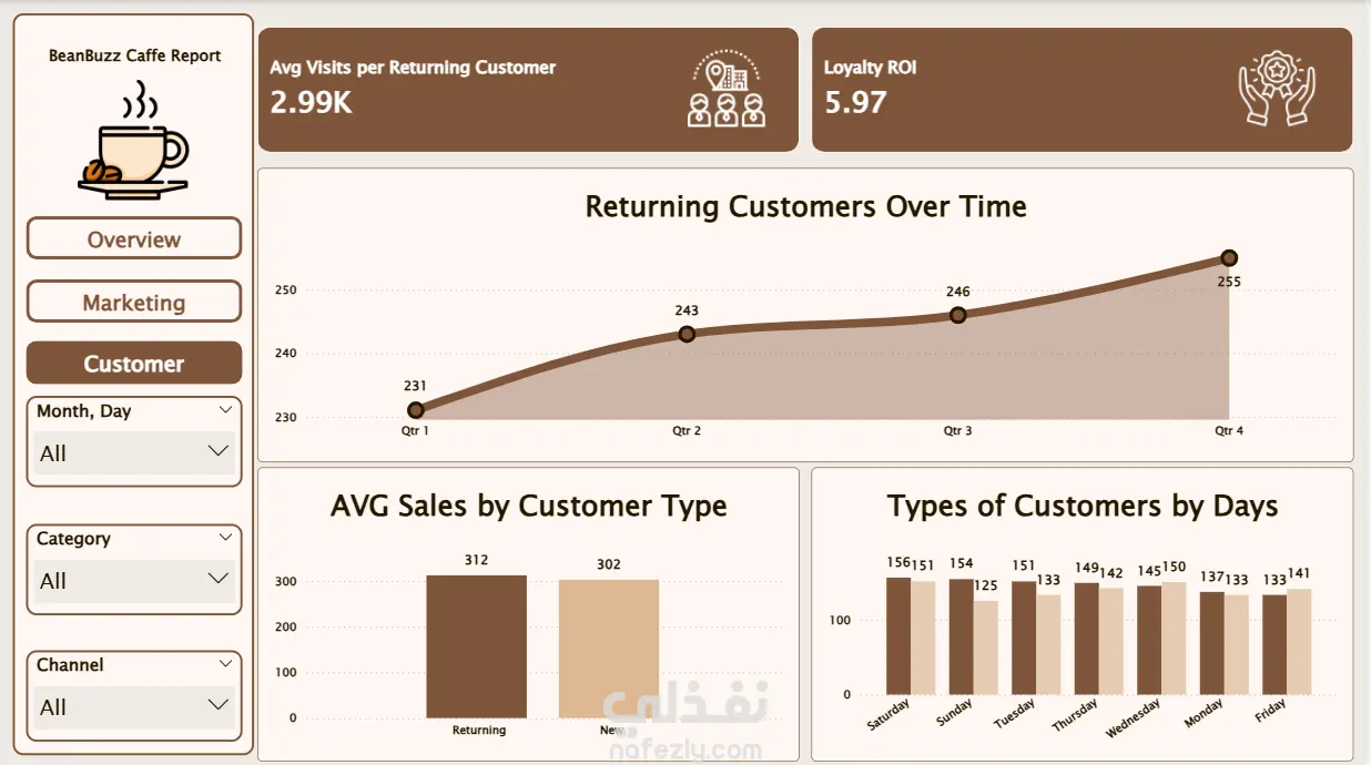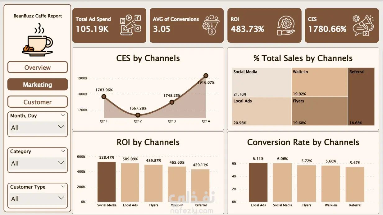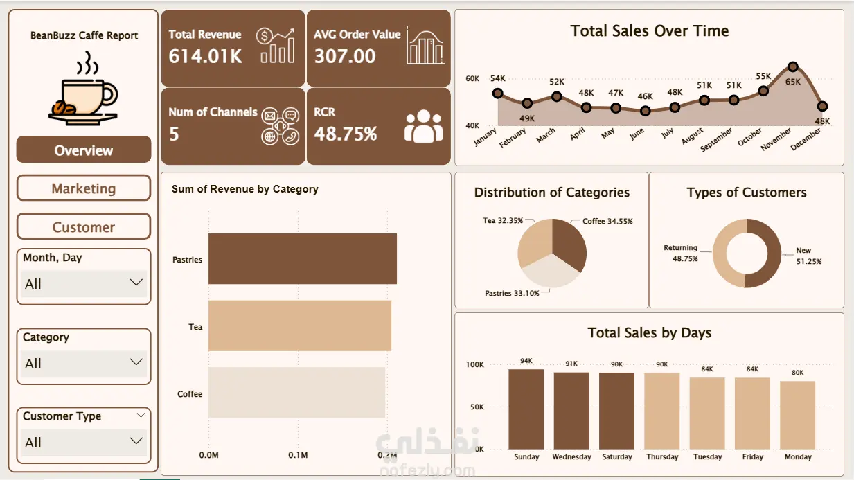 تم إنشاء تقرير احترافي وتفاعلي باستخدام Power BI يتضمن ثلاث لوحات معلومات (Dashboards) رئيسية ، يعرض مؤشرات الأداء الرئيسية مثل إجمالي المبيعات، عدد الطلبات، متوسط قيمة الفاتورة، و نسب ولاء العملاء ، عدد قنوات التسويق ، مع إمكانية استخدام الفلاتر والسلايسرز للتحكم في عرض البيانات بسهولة.