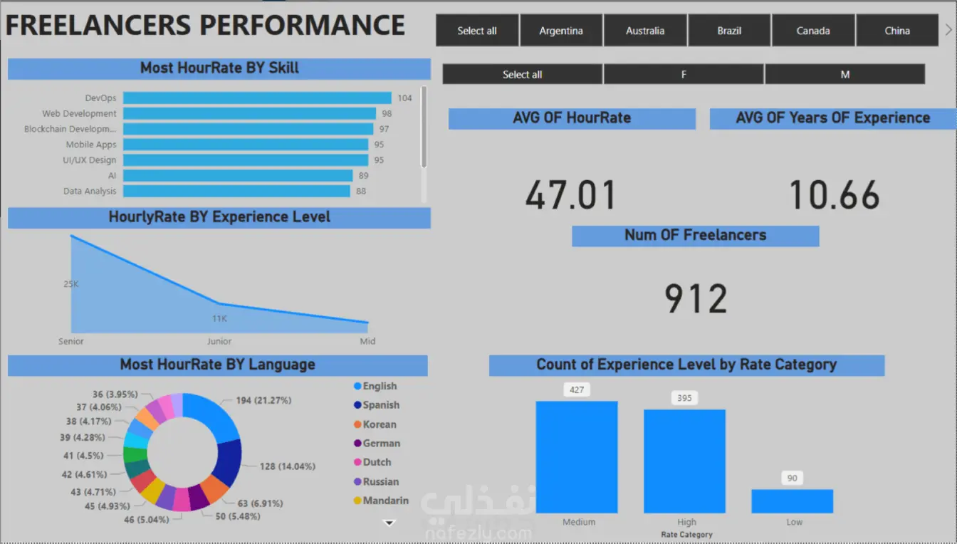 طورت لوحة معلومات تفاعلية على Power BI لتحليل أداء المستقلين وقراءة السوق بشكل سريع وواضح. الداشبورد بتعرض مؤشرات رئيسية مثل متوسط سعر الساعة، متوسط سنوات الخبرة، وإجمالي عدد المستقلين، مع تحليل تفصيلي حسب الدولة، النوع، المهارة، اللغة، ومستويات الخبرة.