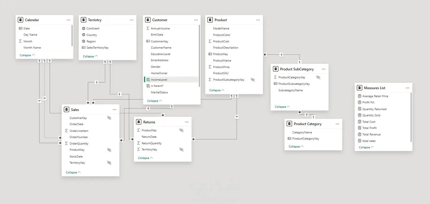 المشكلات الموجودة في البيانات: صفوف فارغة اخطاء في البيانات ما قمت به: ازالة الاخطاء ازالة الصفوف الفارغة حساب measures للاستخدام في التحليل (قيمة الربح - المبيعات - نسبة الربح .....) النتيجة: بيانات نظيفة ومتسقة تحليل بيانات المبيعات
