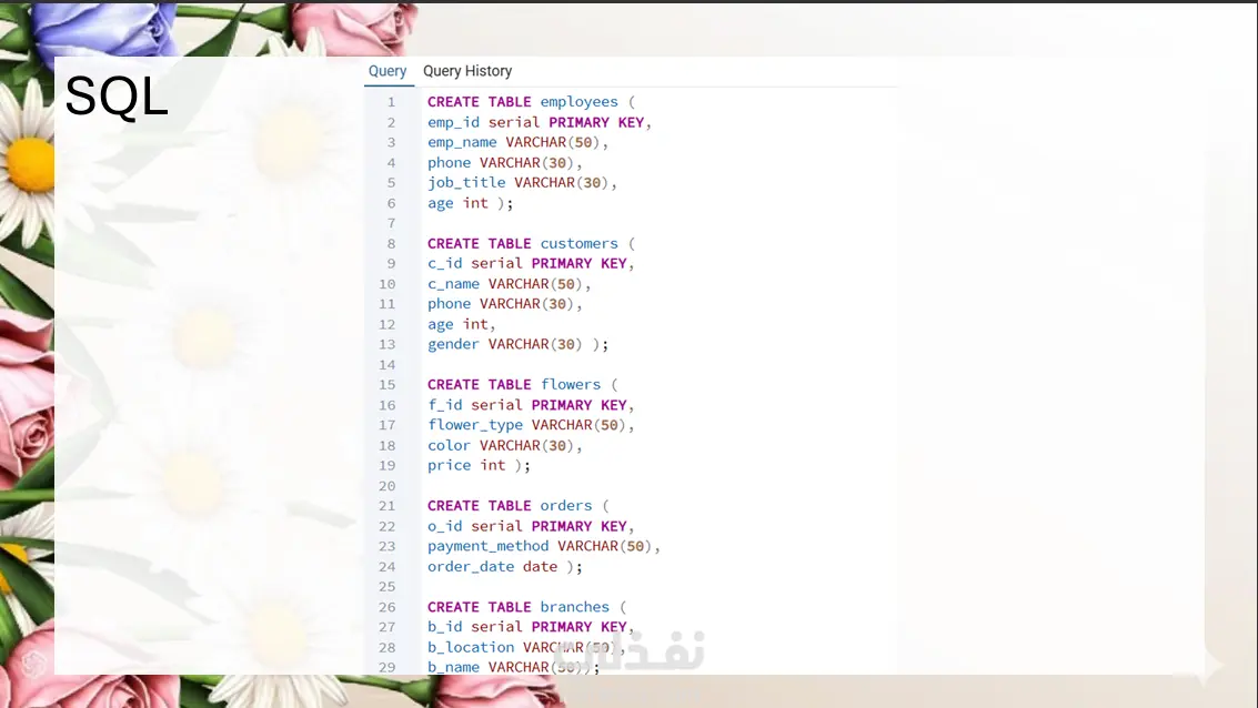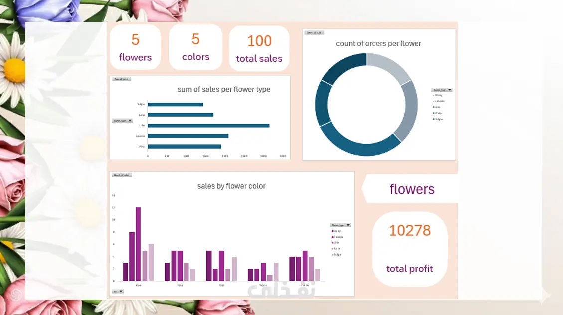 لوحات التحكم (Dashboards) تصميم رسوم بيانية توضح: توزيع المبيعات حسب النوع ولون الزهور. أداء الموظفين وتحليل المبيعات بناءً على أعمارهم. تحليل سلوك العملاء حسب النوع وتوزيع الأرباح السنوي.