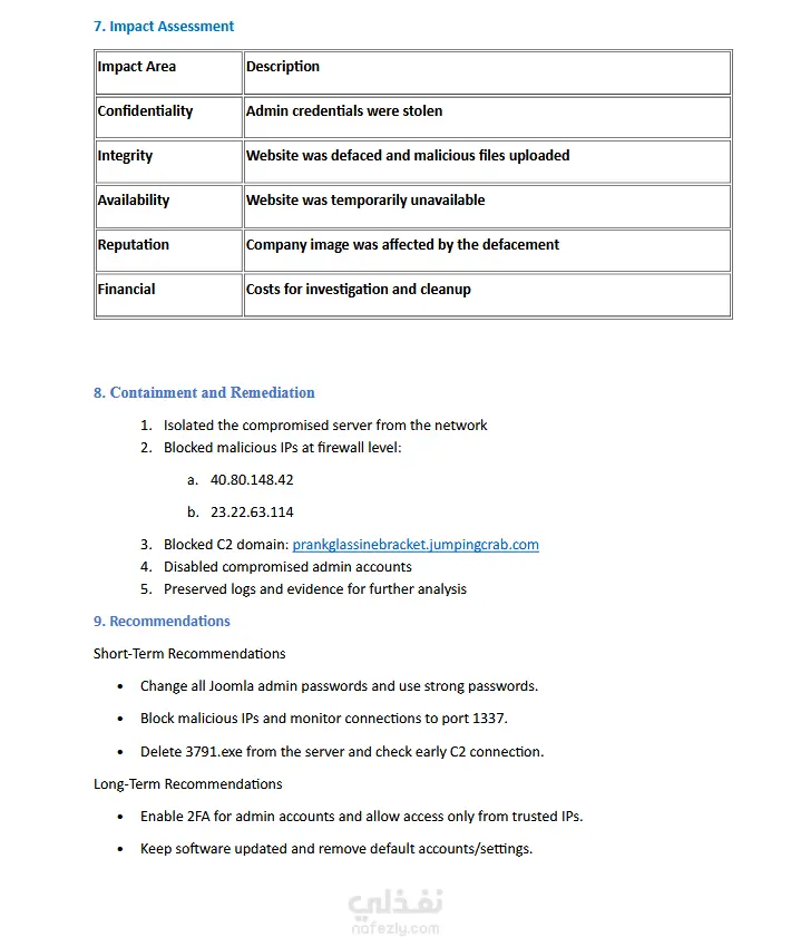 Finally, the report provides impact assessment, containment actions, and security recommendations to help prevent similar attacks in the future.
