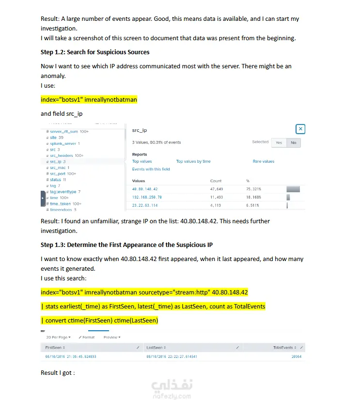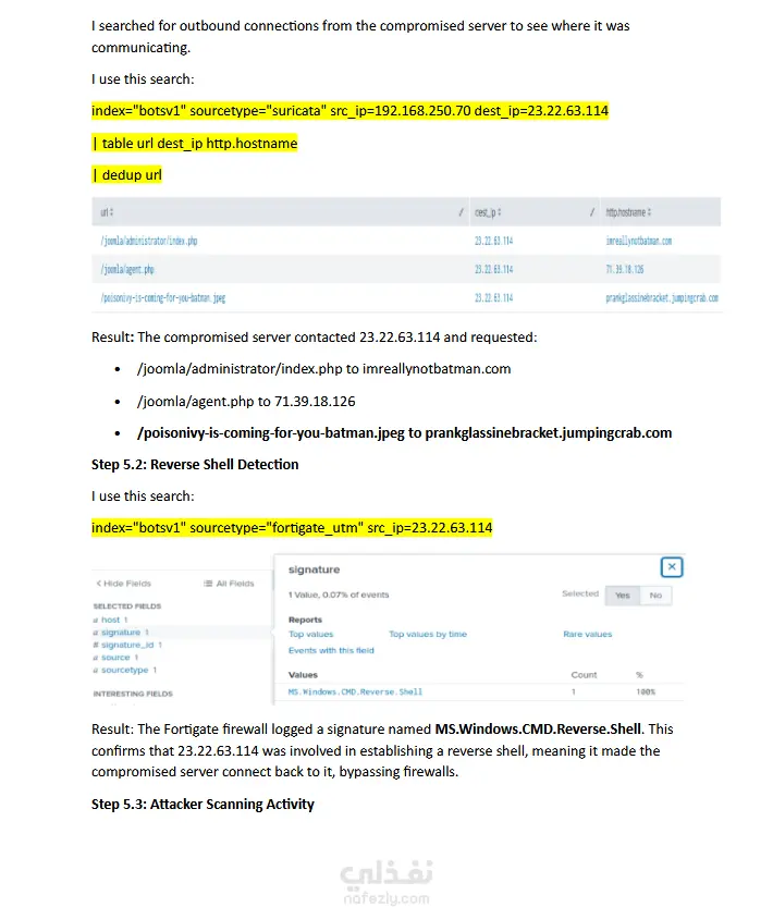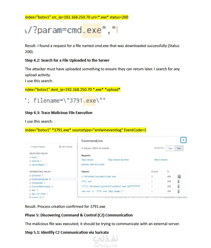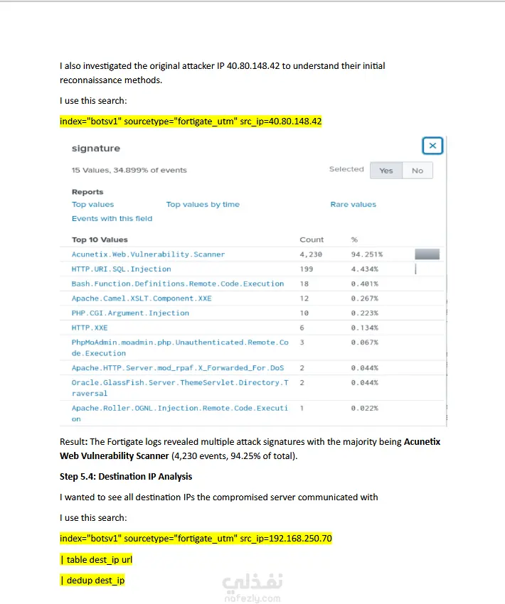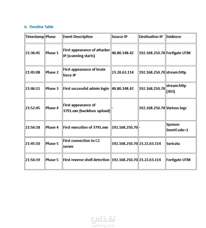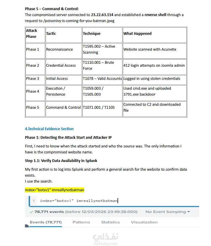 The project documents the full attack lifecycle, including reconnaissance, credential access, initial access, execution, persistence, and command-and-control communication. It also includes detailed Splunk queries, forensic evidence, indicators of compromise (IOCs), and a complete attack timeline based on multiple log sources such as HTTP logs, Suricata alerts, Fortigate firewall logs, and Windows event logs.