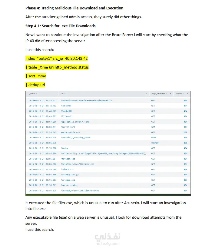 The investigation revealed that the attacker began with reconnaissance using the Acunetix vulnerability scanner, followed by a brute-force attack targeting the Joomla administrator login page. After successfully obtaining valid credentials, the attacker gained administrative access to the server, uploaded a malicious executable (3791.exe), and established a reverse shell connection to a command-and-control (C2) server.