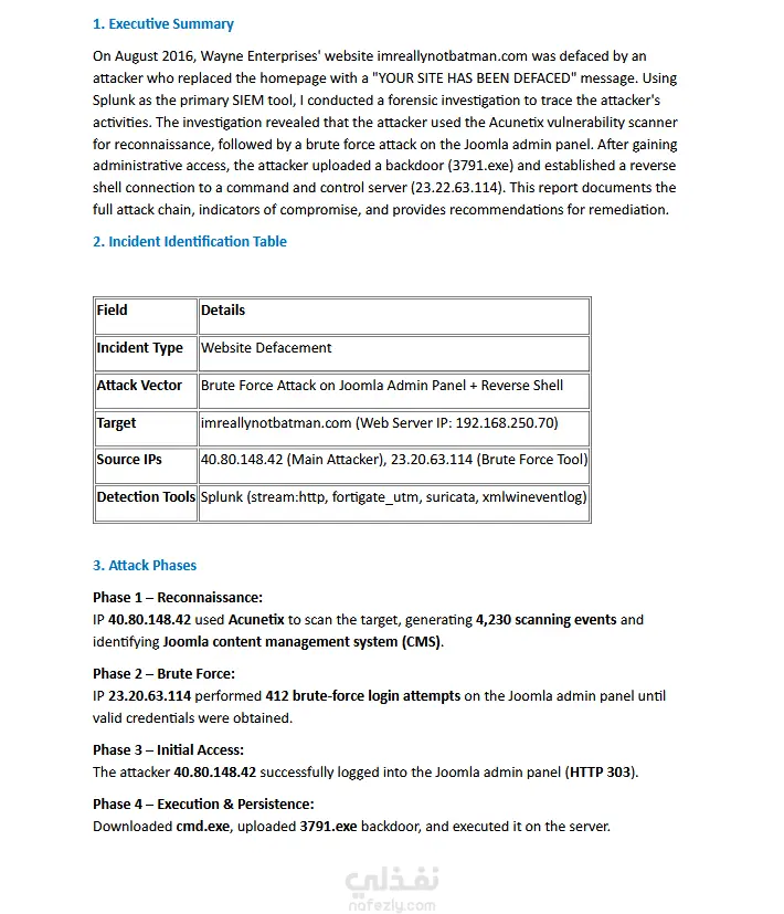 This project presents a full security investigation of a website defacement incident targeting the domain **imreallynotbatman.com**. The analysis was conducted using Splunk as the primary SIEM platform to identify the attacker’s activities, reconstruct the attack timeline, and determine the root cause of the compromise.
