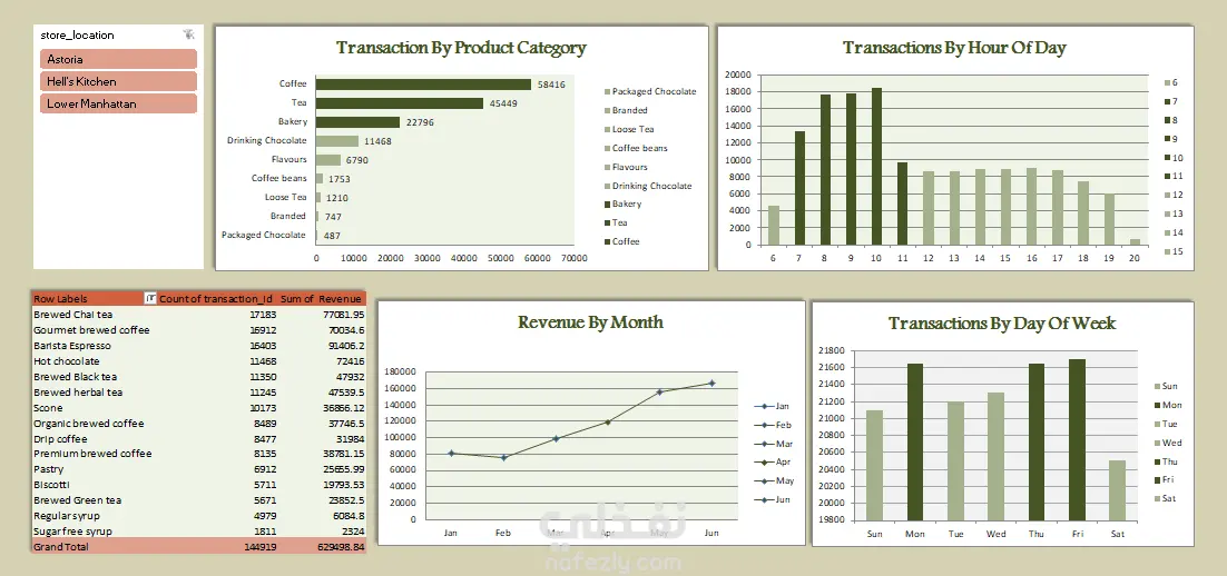 قمت ببناء لوحة معلومات شاملة لأداء المبيعات لتحليل المعاملات حسب فئة المنتج، وساعة اليوم، ويوم الأسبوع، وموقع المتجر، بهدف تحديد أوقات الذروة في المبيعات والمنتجات الأكثر أداءً. استخدمت الجداول المحورية (Pivot Tables) وتقنيات تصور البيانات لتتبع اتجاهات الإيرادات الشهرية والأداء العام للمعاملات، مما يساعد على اتخاذ قرارات تشغيلية وتسويقية مبنية على البيانات.