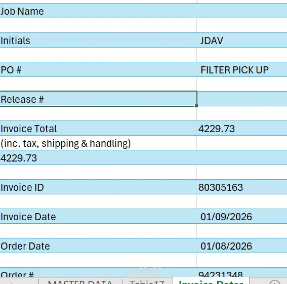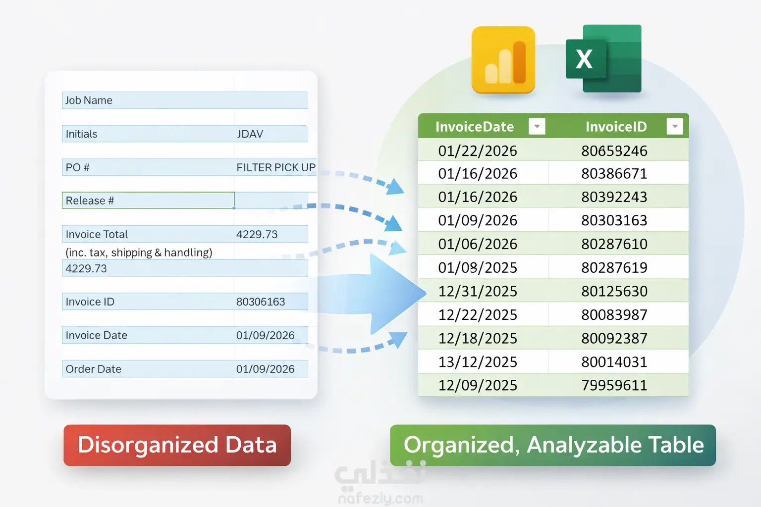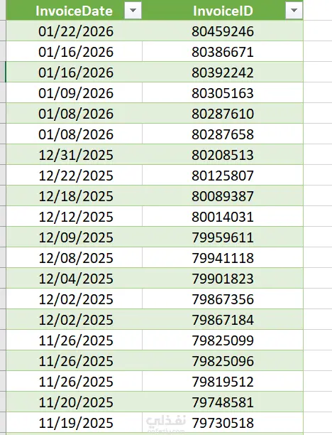 قمت بتحويل بيانات فواتير كانت موجودة في ملف Excel بشكل غير منظم (نموذج يشبه التقارير أو النماذج المطبوعة) إلى جدول بيانات منظم وقابل للتحليل.