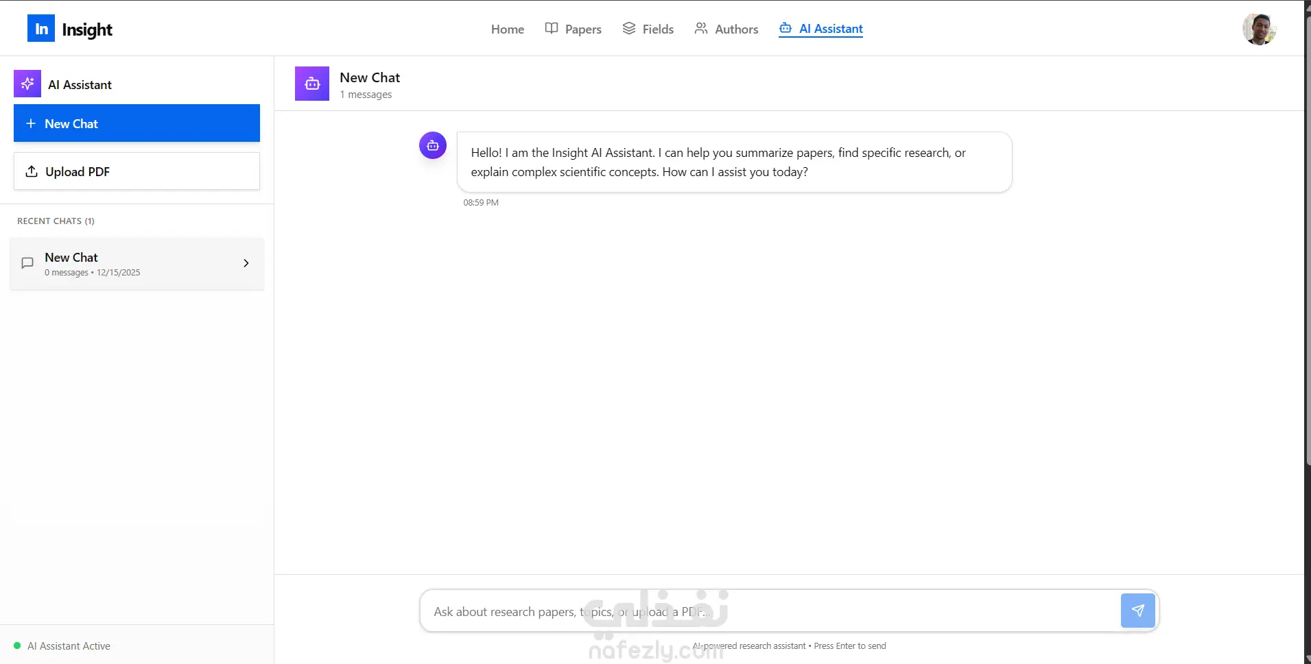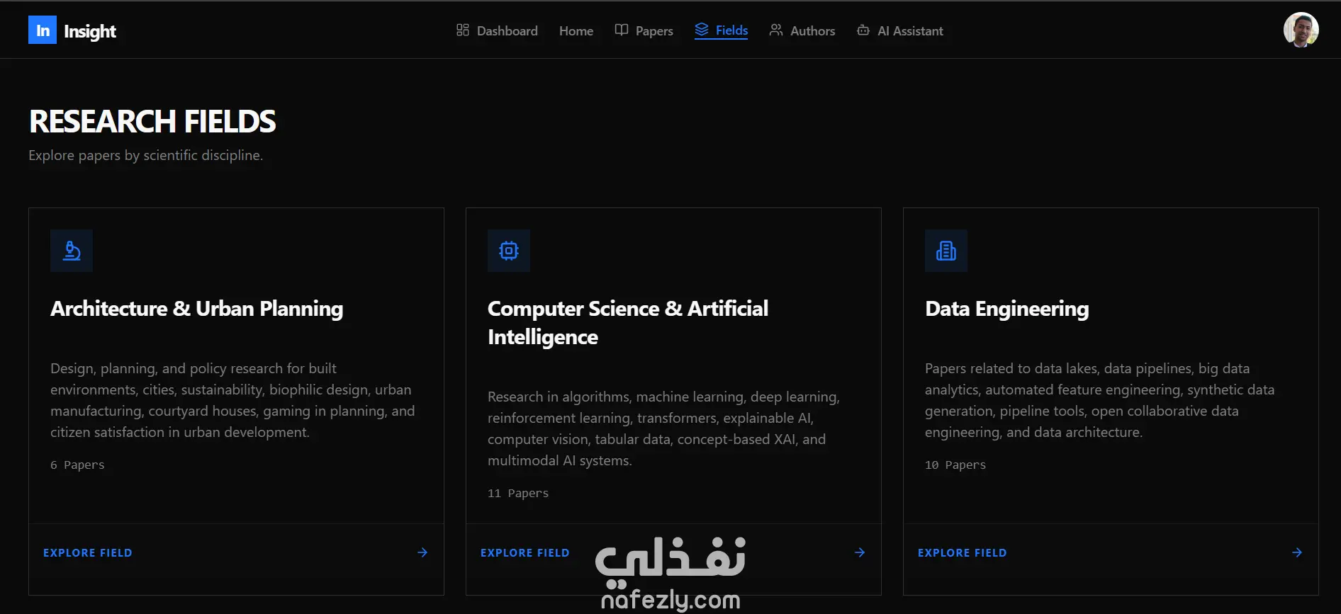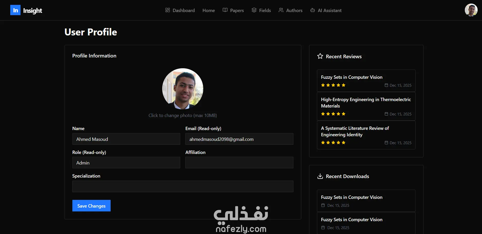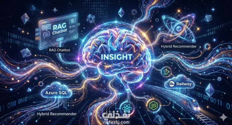 منصة أكاديمية حديثة صُممت لإحداث نقلة نوعية في طريقة تفاعل الباحثين مع المعرفة العلمية. تم بناء النظام على بنية تحتية قوية تعتمد على خوادم "Azure SQL"، حيث يتجاوز النظام مجرد إدارة البيانات التقليدية ليتعامل مع مخططات بيانات معقدة، ويتميز بتخزين صور المؤلفين كبيانات ثنائية (BLOBs) مباشرة داخل قاعدة البيانات، مما يضمن أعلى درجات تكامل ومركزية البيانات. تتميز المنصة بدمج تقنيات الذكاء الاصطناعي المتقدمة بشكل جوهري. فقد قمنا بتنفيذ روبوت محادثة (Chatbot) يعتمد على تقنية "التوليد المعزز بالاسترجاع" (RAG)، مما يتيح للمستخدمين إجراء "محادثات" طبيعية مع الأوراق البحثية لاستخلاص النتائج والرؤى بسرعة فائقة. بالإضافة إلى ذلك، تم بناء نظام توصية هجين (Hybrid Recommender System) لتخصيص المحتوى؛ حيث يستخدم خوارزميات "TF-IDF" و"تشابه جيب التمام" (Cosine Similarity) لتحليل النصوص (توصية مبنية على المحتوى) مع الاستفادة من سجل تصفح المستخدم (توصية مبنية على المعرفة) لاقتراح قراءات دقيقة وذات صلة. من الناحية التقنية، يربط التطبيق بين واجهة أمامية سريعة الاستجابة مبنية بتقنية "React"، وواجهة خلفية قابلة للتوسع تعتمد على "Node.js". وقد تم نشر النظام البيئي للمشروع بالكامل عبر منصة "Railway"، لينجح "Insight" في الدمج بين هندسة قواعد البيانات الدقيقة وقدرات التعلم الآلي الحديثة، مما يخلق تجربة بحثية علمية متكاملة.