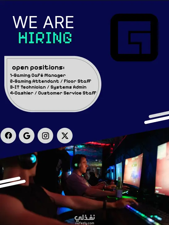 هذا العمل عبارة عن تصميم إعلان توظيف لمقهى ألعاب إلكترونية (Gaming Café)، يهدف إلى جذب المتقدمين للوظائف بطريقة بصرية حديثة تناسب بيئة الألعاب. يعتمد التصميم على ألوان داكنة مع لمسات مضيئة تعكس أجواء الجيمنج والتقنية، مع عنوان رئيسي واضح "We Are Hiring" لجذب الانتباه بسرعة. يتضمن الإعلان قسمًا يوضح الوظائف المتاحة مثل مدير مقهى الألعاب، موظف صالة الألعاب، فني تقنية معلومات أو مسؤول أنظمة، بالإضافة إلى موظف كاشير وخدمة عملاء. كما يحتوي التصميم على شعار المكان لتعزيز الهوية البصرية، وصورة للاعبين داخل بيئة ألعاب حقيقية لإعطاء انطباع واقعي عن طبيعة العمل. كذلك تمت إضافة أيقونات وسائل التواصل الاجتماعي لتسهيل التواصل مع المهتمين بالوظائف، مما يجعل الإعلان مناسبًا للنشر على منصات التواصل الاجتماعي أو مواقع التوظيف.