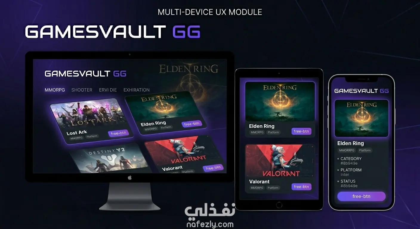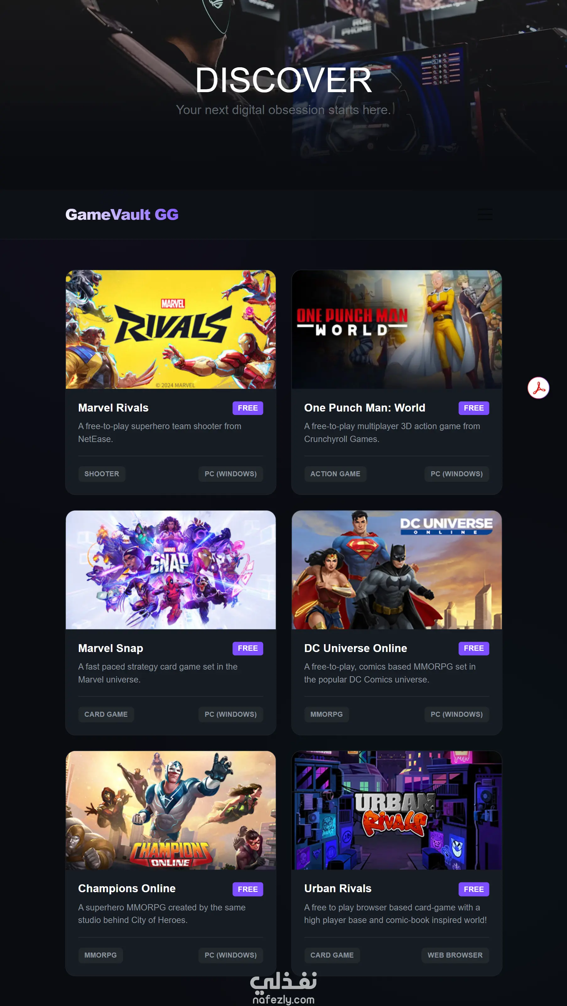 يعتمد الموقع على Navbar تحتوي على تصنيفات مثل: MMORPG — Shooter — Sailing — Permadeath — Superhero — Pixel، مع إمكانية فتح صفحة تفاصيل لكل لعبة وعرض معلوماتها بالكامل، بالإضافة إلى رابط مباشر لفتح موقع اللعبة.