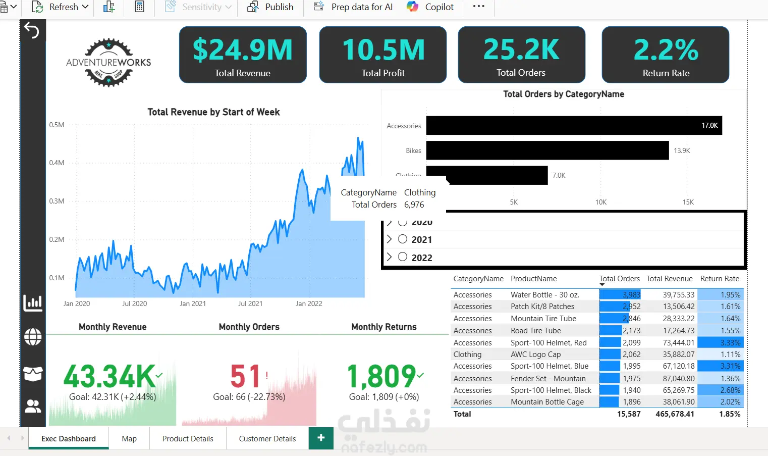 لقد قمت بتصميم داشبورد تفاعلي باستخدام بيانات AdventureWorks يهدف إلى تحليل أداء المبيعات والموظفين والعملاء بشكل شامل وواضح. مميزات الداشبورد: عرض المبيعات حسب المنتجات والفروع والعملاء بشكل رسومي واضح تحليل أداء الموظفين والمندوبين مع مقارنات شهرية وسنوية تتبع مؤشرات الأداء الرئيسية (KPIs) مثل الإيرادات، نسبة المبيعات حسب الفئة، ومتوسط حجم الطلب إمكانية التصفية والتفاعل مع البيانات لرؤية تفاصيل معينة بسهولة تصميم مرتب وسهل الاستخدام مناسب لاتخاذ القرارات الإدارية