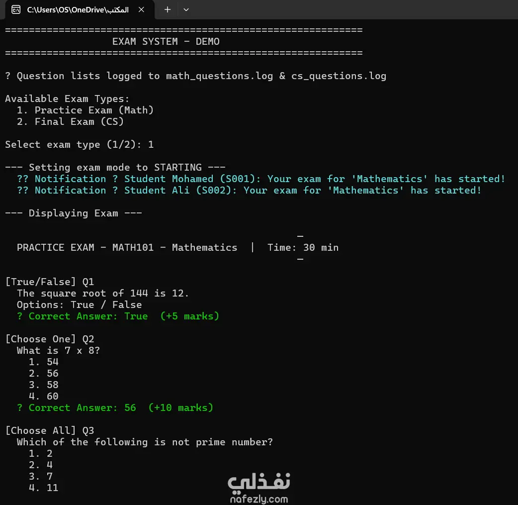 مشروع عبارة عن نظام امتحانات إلكتروني بسيط تم تطويره باستخدام لغة C# كتطبيق Console Application يعمل من خلال نافذة الأوامر (Command Line). يقوم البرنامج بعرض امتحانين تجريبيين لمادتي الرياضيات (Math) و علوم الحاسب (CS)، حيث يحتوي كل امتحان على مجموعة من الأسئلة ويطلب من المستخدم اختيار الإجابات المناسبة. بعد انتهاء المستخدم من الإجابة على جميع الأسئلة، يقوم النظام بعملية تصحيح تلقائي للإجابات ثم يعرض النتيجة النهائية للمستخدم. يعتمد المشروع كذلك على إنشاء قاعدة بيانات بسيطة باستخدام C# لتخزين الأسئلة والإجابات الخاصة بالامتحانات، مع تطبيق عملي يوضح فكرة أنظمة الاختبارات الإلكترونية بشكل مبسط. مميزات المشروع: تطوير التطبيق باستخدام C# Console Application. تشغيل البرنامج كملف .exe على جهاز الكمبيوتر. عرض امتحانين تجريبيين لمادتي Math و CS. تصحيح تلقائي للإجابات وعرض النتيجة للمستخدم. مثال عملي بسيط لفكرة أنظمة الامتحانات الإلكترونية.