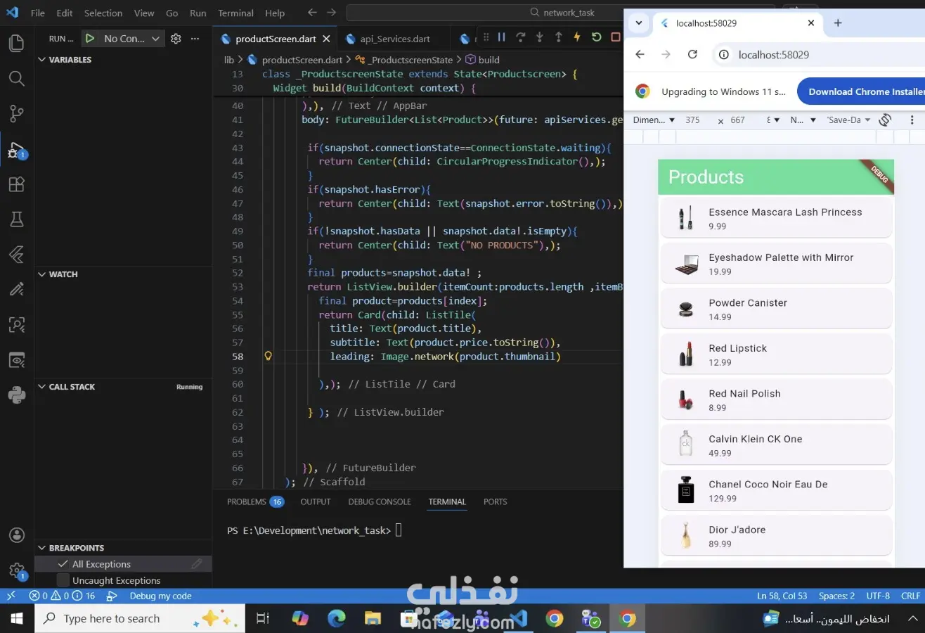 برمجة واجهة لعرض المنتجات تعتمد على جلب البيانات من REST API. تم استخدام FutureBuilder للتعامل مع طلبات الشبكة، وعرض مؤشر تحميل (CircularProgressIndicator) لحين وصول البيانات، مع عرض المنتجات داخل ListView و Cards بشكل منظم وسلس.