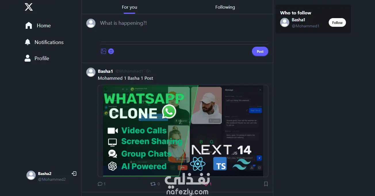 A full-stack responsive X (Twitter) clone. Tech Stack: - Cloudinary - Express.js - JavaScript - MongoDB - Mongoose - Node.js - React - Tailwind CSS - TanStack Query