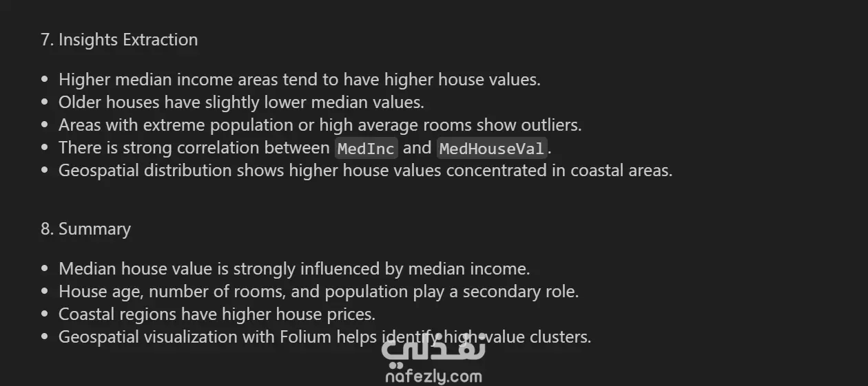تحليل العقارات والتعلم الآلي. يهدف التحليل إلى اكتشاف الأنماط والعلاقات والرؤى حول أسعار المساكن في مختلف المناطق بكاليفورنيا، مما يوفر فهماً قيماً للعوامل التي تؤثر على القيمة المتوسطة للمساكن. الأهداف: دراسة توزيع وخصائص المتغيرات المرتبطة بالإسكان تحديد الارتباطات بين المتغيرات المختلفة وتأثيرها على أسعار المساكن اكتشاف الأنماط والقيم الشاذة ومشكلات جودة البيانات المحتملة تصور التوزيع الجغرافي لأسعار المساكن عبر كاليفورنيا توليد رؤى قابلة للتطبيق لأصحاب المصلحة في القطاع العقاري الأدوات والتقنيات: بايثون (Pandas, NumPy) لمعالجة وتحليل البيانات Matplotlib و Seaborn للتصورات الإحصائية Folium للخرائط الجغرافية التفاعلية Scikit-learn للحصول على مجموعة البيانات المنهجية: الحصول على البيانات والاستكشاف الأولي: تم تحميل مجموعة البيانات باستخدام Scikit-learn وإجراء فحص أولي يشمل أنواع البيانات والقيم المفقودة والإحصائيات الأساسية. تنظيف البيانات: تحديد وإزالة السجلات المكررة لضمان سلامة البيانات. التحليل الاستكشافي: تحليل توزيع القيم المتوسطة للمساكن باستخدام الرسوم البيانية ومخططات كثافة التوزيع فحص الارتباطات من خلال خرائط الحرارة ورسوم الأزواج دراسة العلاقات بين المتغيرات الرئيسية (الدخل المتوسط، عمر المنزل، متوسط عدد الغرف) وأسعار المساكن اكتشاف القيم الشاذة باستخدام تحليل المخططات الصندوقية التصور الجغرافي: إنشاء خريطة تفاعلية باستخدام Folium لتصور التوزيع الجغرافي لأسعار المساكن عبر كاليفورنيا، مع علامات ملونة تشير إلى قيم العقارات. النتائج الرئيسية: يُظهر متوسط الدخل أقوى ارتباط إيجابي مع قيم المساكن، مما يشير إلى أن مستويات الدخل هي محرك رئيسي للأسعار أسعار المساكن ليست موزعة بشكل موحد جغرافياً، حيث تسجل المناطق الساحلية عموماً قيماً أعلى يتسم توزيع قيم المساكن بانحراف إيجابي، مما يشير إلى تركيز العقارات في نطاقات الأسعار المنخفضة مع وجود عدد أقل من القيم المرتفعة يُظهر عمر المنزل ارتباطاً ضئيلاً بالأسعار، مما يشير إلى أن الموقع والدخل هما عاملان أكثر تأثيراً الخلاصة: يوفر هذا التحليل أساساً شاملاً لفهم سوق الإسكان في كاليفورنيا. يمكن للرؤى المستخلصة أن تفيد جهود النمذجة التنبؤية وتدعم اتخاذ القرارات المبنية على البيانات للمستثمرين العقاريين وصناع السياسات ومخططي المدن. يُظهر المشروع كفاءة في تحليل البيانات وتقنيات التصور والخرائط الجغرافية.
