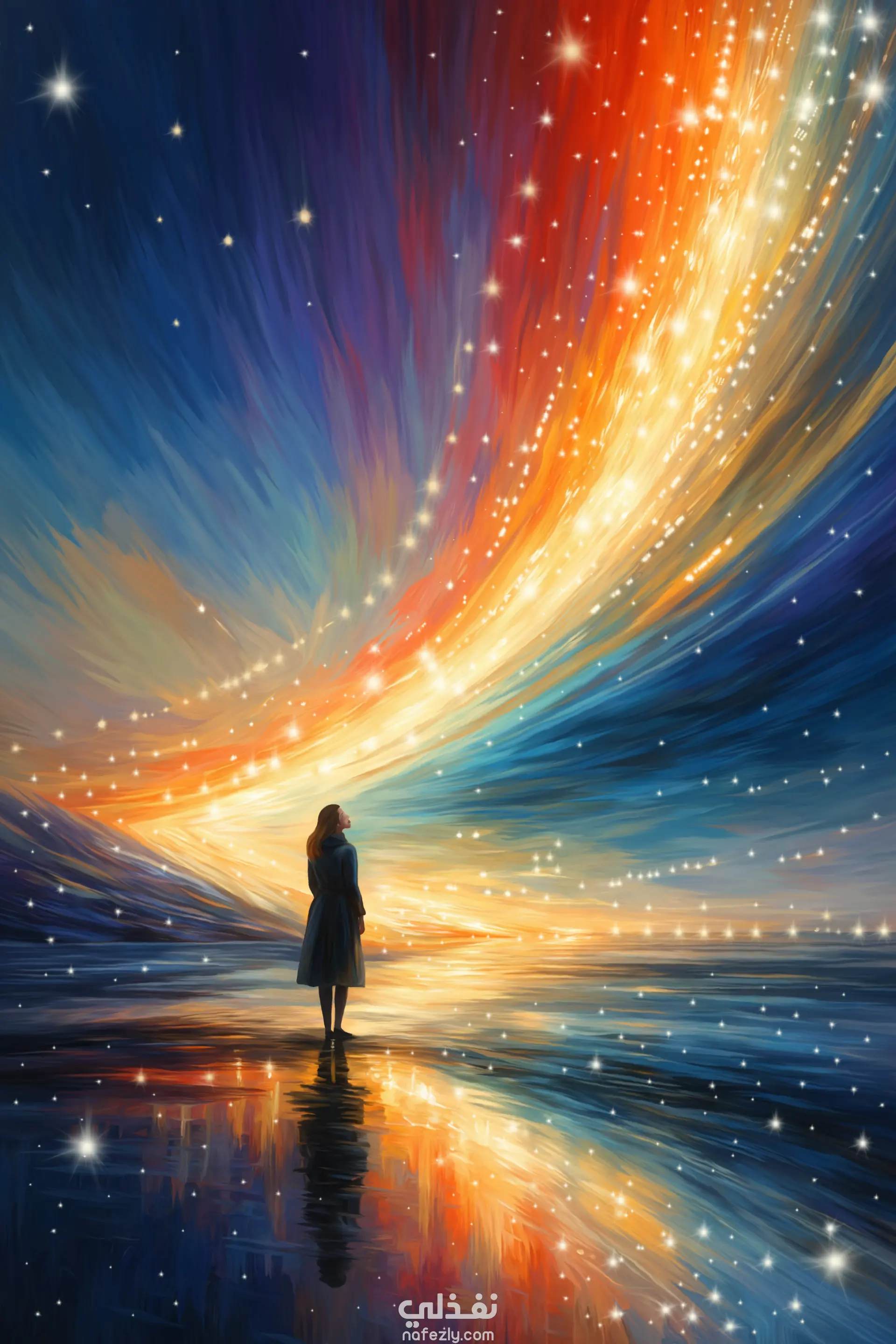 تقف شخصية نسائية وحيدة بثبات عند عتبة التأمل، مجسدة الحضور والعزيمة. ومن هذا السكون تنطلق موجة واسعة من الطاقة ترتفع وتتمدد عبر التكوين، مشكلةً حركة متدفقة من الألوان والإيقاع البصري.