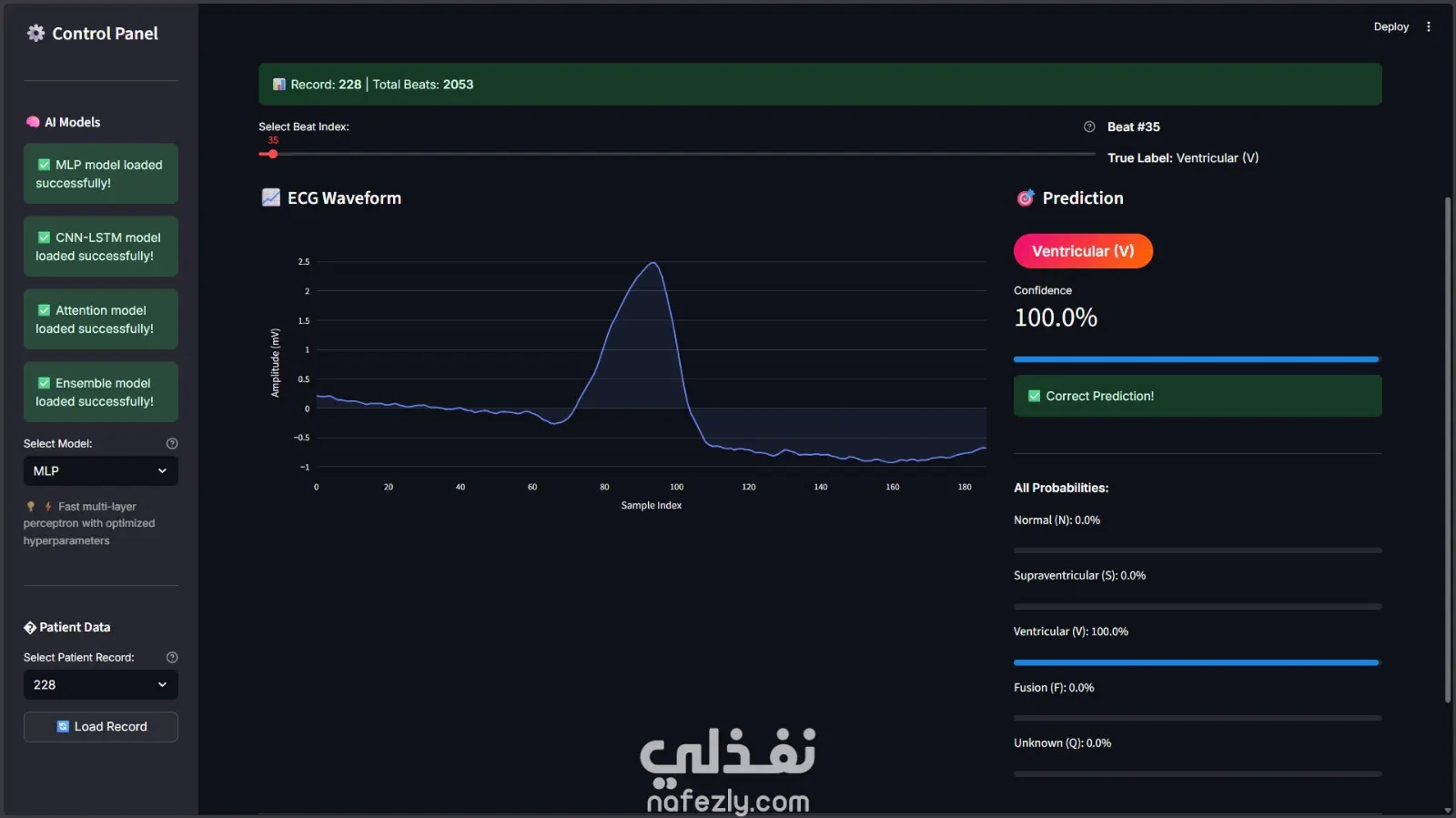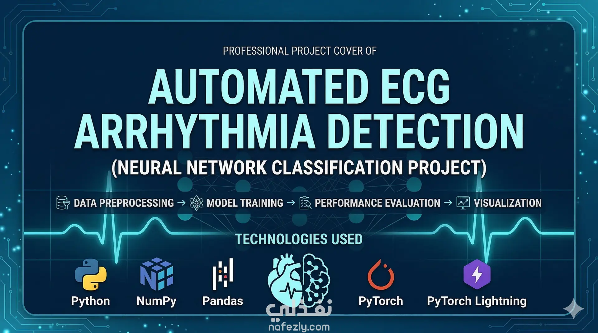الكشف التلقائي عن اضطرابات نبضات القلب — تصنيف بالشبكات العصبية هذا المشروع يقدم نظامًا آليًا للكشف عن اضطرابات ضربات القلب وتصنيفها من إشارات ECG باستخدام التعلم العميق. النموذج مُدرَّب على التعرف على الأنماط داخل بيانات ECG الخام والتمييز بين حالات إيقاع القلب المختلفة. يغطي المشروع دورة العمل الكاملة لتعلم الآلة — من المعالجة المسبقة للبيانات وتدريب النموذج وصولًا إلى تقييم الأداء وتصوير النتائج. بُني المشروع بتركيز على هيكل كود نظيف وقابلية التكرار وخط أنابيب منظم للتعلم الآلي. **التقنيات المستخدمة:** Python · PyTorch · PyTorch Lightning · الشبكات العصبية · NumPy · Pandas