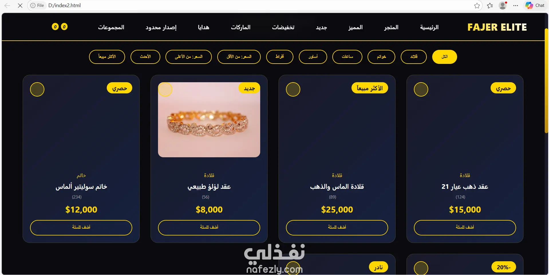 قمت بتصميم وتطوير متجر إلكتروني لعرض وبيع المجوهرات بطريقة أنيقة واحترافية، حيث يتيح الموقع للزوار تصفح مجموعة متنوعة من المنتجات مثل الخواتم، القلادات، الأساور، والأقراط مع عرض الصور والتفاصيل والأسعار بشكل واضح.