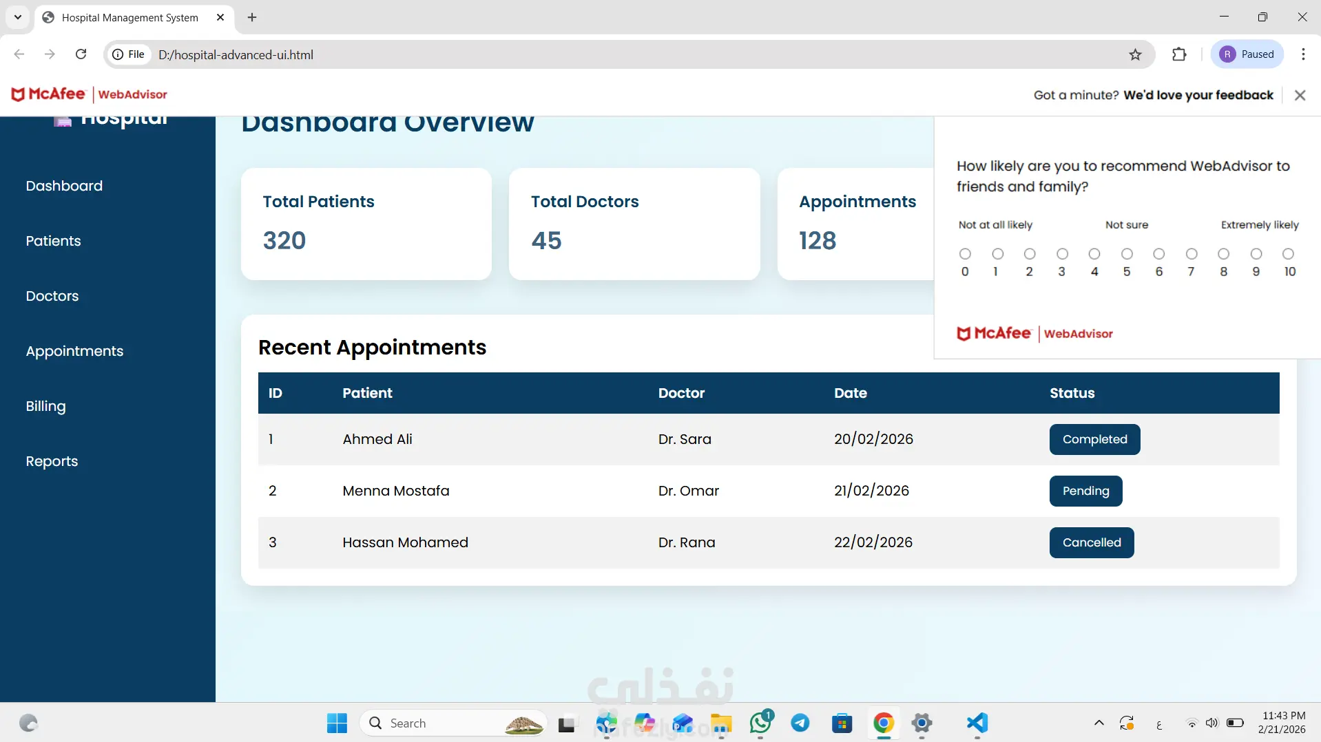 قمت بتصميم وتطوير موقع ويب متكامل لإدارة خدمات المستشفى وتسهيل التواصل بين المرضى والأطباء. يتيح الموقع للمرضى تصفح التخصصات الطبية المختلفة والتعرف على الأطباء المتاحين مع عرض معلوماتهم وساعات العمل الخاصة بهم.