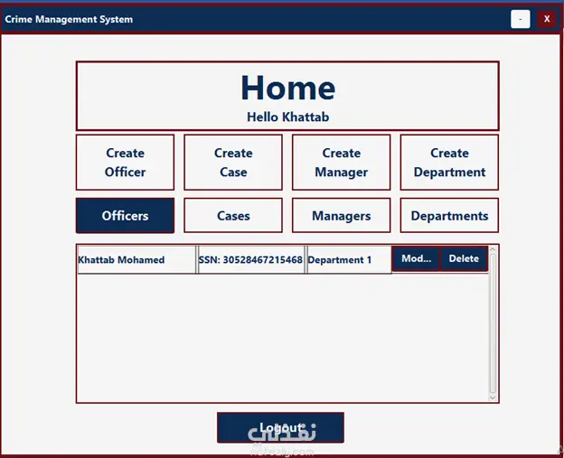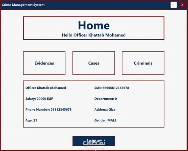 Developed a comprehensive Crime Management System using Java and JavaFX to streamline criminal case management for law enforcement agencies. The system allows for efficient tracking of cases, suspects, victims, witnesses, and evidence, with role-based access for admins, officers, and managers. Key features include: Case Management: Create, update, and track criminal cases with unique CaseIDs. Evidence Tracking: Add, update, and remove evidence linked to specific cases. Criminal Profiling: Calculate danger levels (High, Moderate, Low) based on crimes committed. User Roles: Admins manage system-wide operations, officers handle case details, and managers oversee case assignments. File Handling: Persistent storage of data using file I/O operations. Built with object-oriented principles, the system features modular classes for citizens, officers, criminals, and cases, ensuring scalability and maintainability. The JavaFX-based UI provides an intuitive interface for seamless navigation and data management. This project enhanced my skills in Java backend development, data management, and UI design, while addressing real-world challenges in law enforcement workflows.