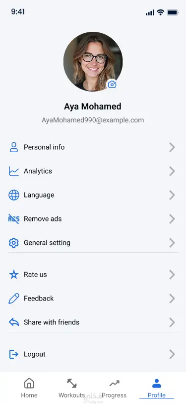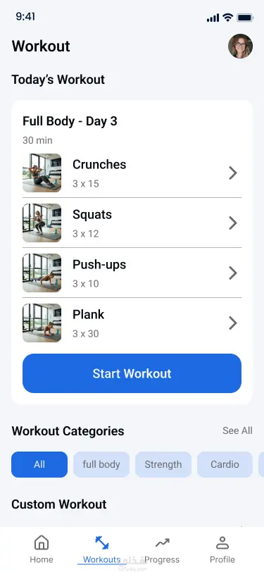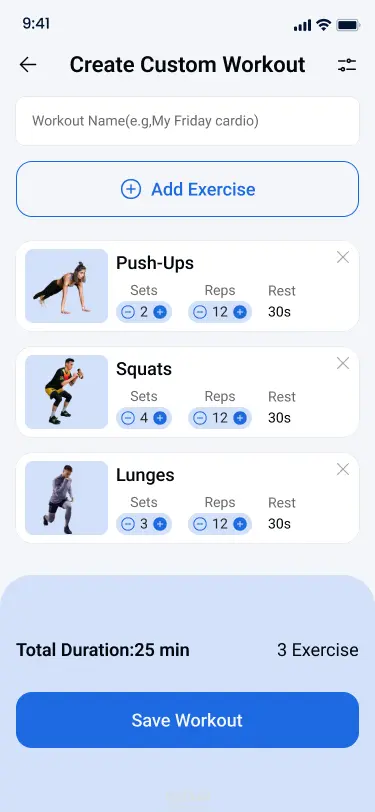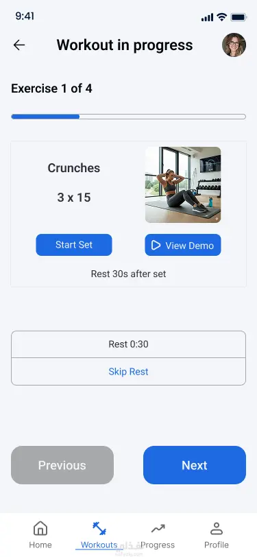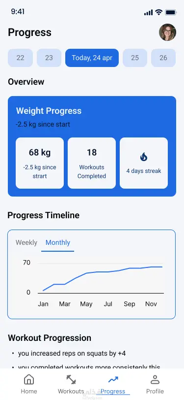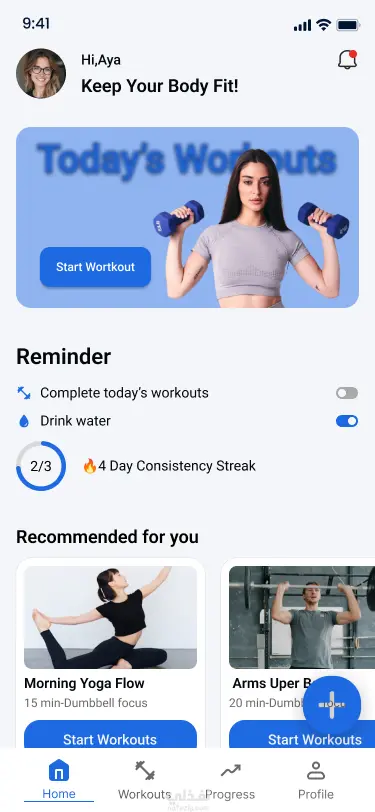 قمت بتصميم واجهة تفاعلية لتطبيق متابعة اللياقة مع لوحات عرض التمرينات والتقدم، لضمان سهولة الاستخدام وتحفيز المستخدمين على الاستمرار في التدريب.