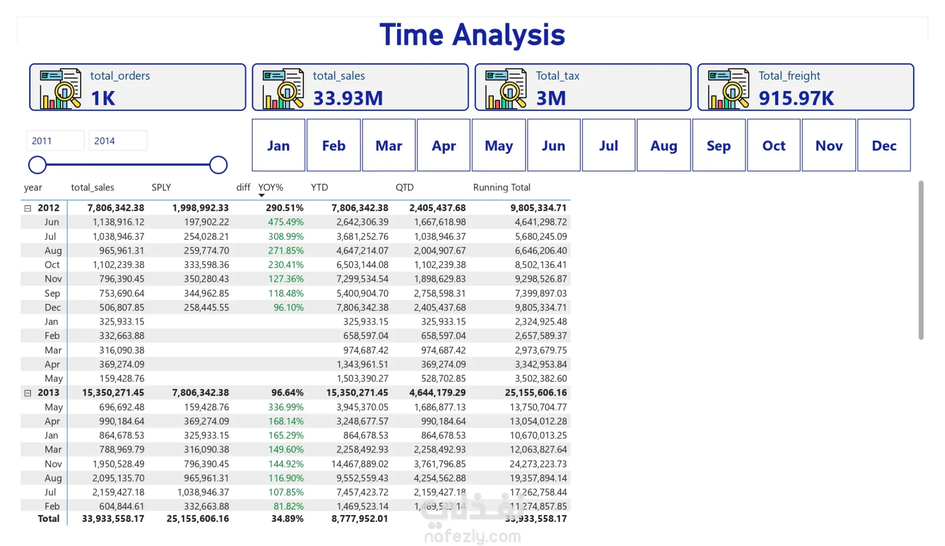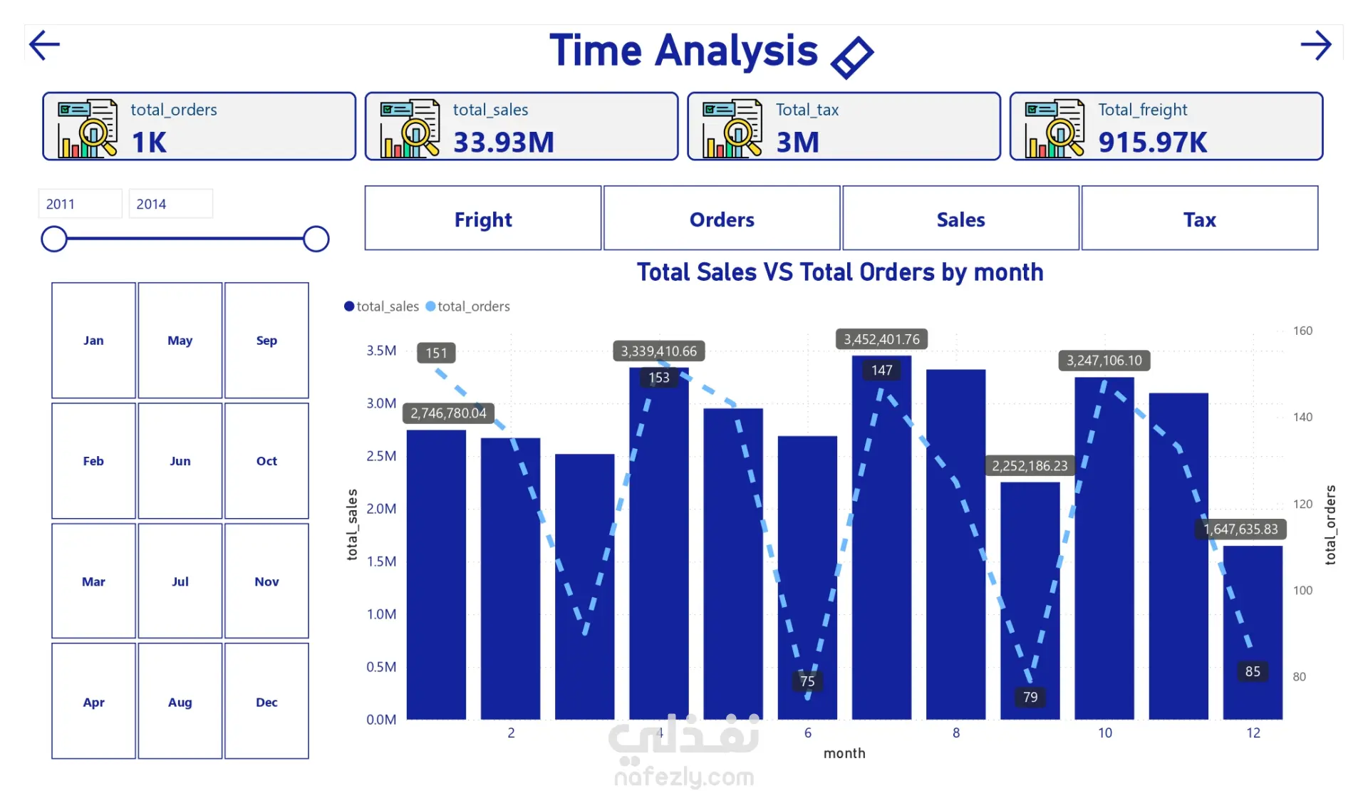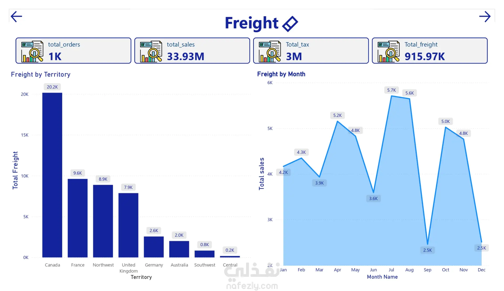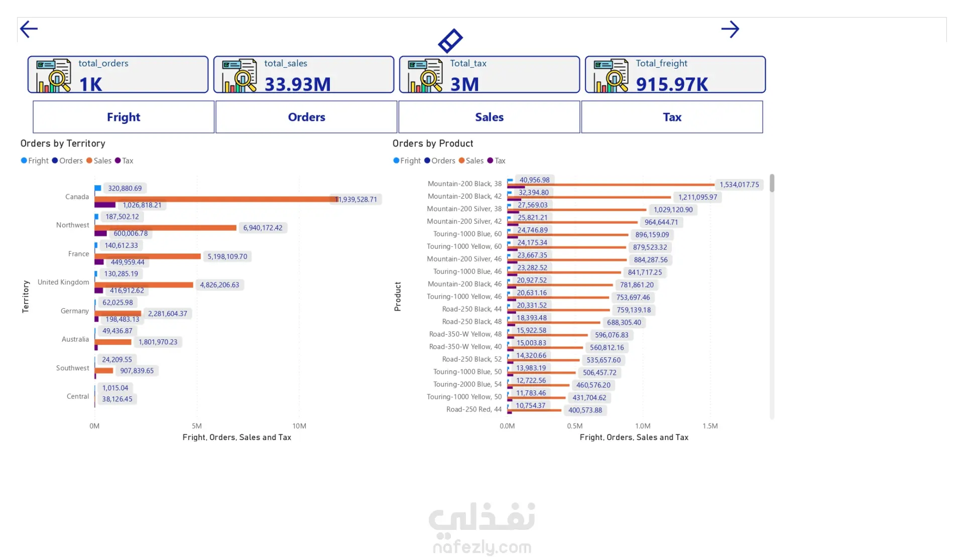 أهم المؤشرات (Key Performance Indicators - KPIs) إجمالي المبيعات (Total Sales): حققت مبيعات بقيمة 33.93 مليون دولار. إجمالي الطلبات (Total Orders): وصل حجم الطلبات إلى 1,000 طلب. إجمالي الضرائب (Total Tax): بلغت حوالي 3 مليون دولار. تكاليف الشحن (Total Freight): بلغت 915.97 ألف دولار. التحليلات التفصيلية (Deep Dive Analysis) التحليل الجغرافي (Territory Analysis): تتصدر كندا (Canada) المناطق من حيث تكاليف الشحن بقيمة 20.2 ألف دولار. تحليل المنتجات (Product Performance): يتم تحليل المبيعات حسب فئات: الإكسسوارات، الملابس، الدراجات، والمكونات. يعد منتج Mountain-200 Black, 38 من المنتجات القيادية في حجم المبيعات بقيمة 1,534,017.75 دولار. يتصدر AWC Logo Cap قائمة المنتجات من حيث عدد الطلبات. التحليل الزمني (Time Analysis): سجل شهر يوليو (July) ذروة في المبيعات بقيمة 3.45 مليون دولار. كان شهر ديسمبر (December) هو الأقل مبيعاً بقيمة 1.65 مليون دولار. تغطي اللوحة مقارنات متقدمة للسنوات من 2011 إلى 2014.