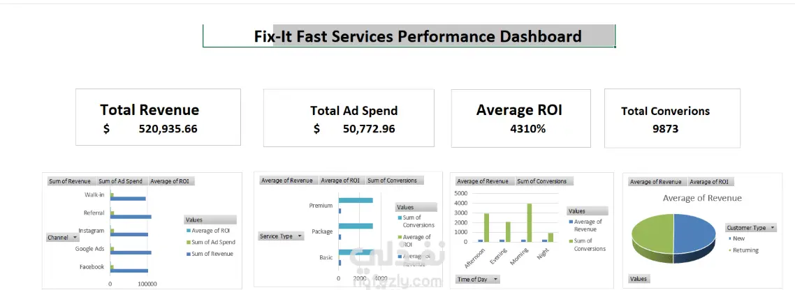 تصميم وتطوير لوحة معلومات (Dashboard) لتحليل أداء الحملات التسويقية وخدمات شركة Fix-It Fast. يهدف المشروع إلى متابعة مؤشرات الأداء الرئيسية مثل إجمالي الإيرادات، إجمالي الإنفاق الإعلاني، معدل العائد على الاستثمار (ROI)، وعدد التحويلات. كما يعرض تحليل الأداء حسب قنوات التسويق المختلفة، ونوع الخدمة، وأوقات اليوم، بالإضافة إلى مقارنة العملاء الجدد والعملاء العائدين، مما يساعد في فهم سلوك العملاء وتحسين قرارات التسويق وزيادة العائد من الحملات الإعلانية.