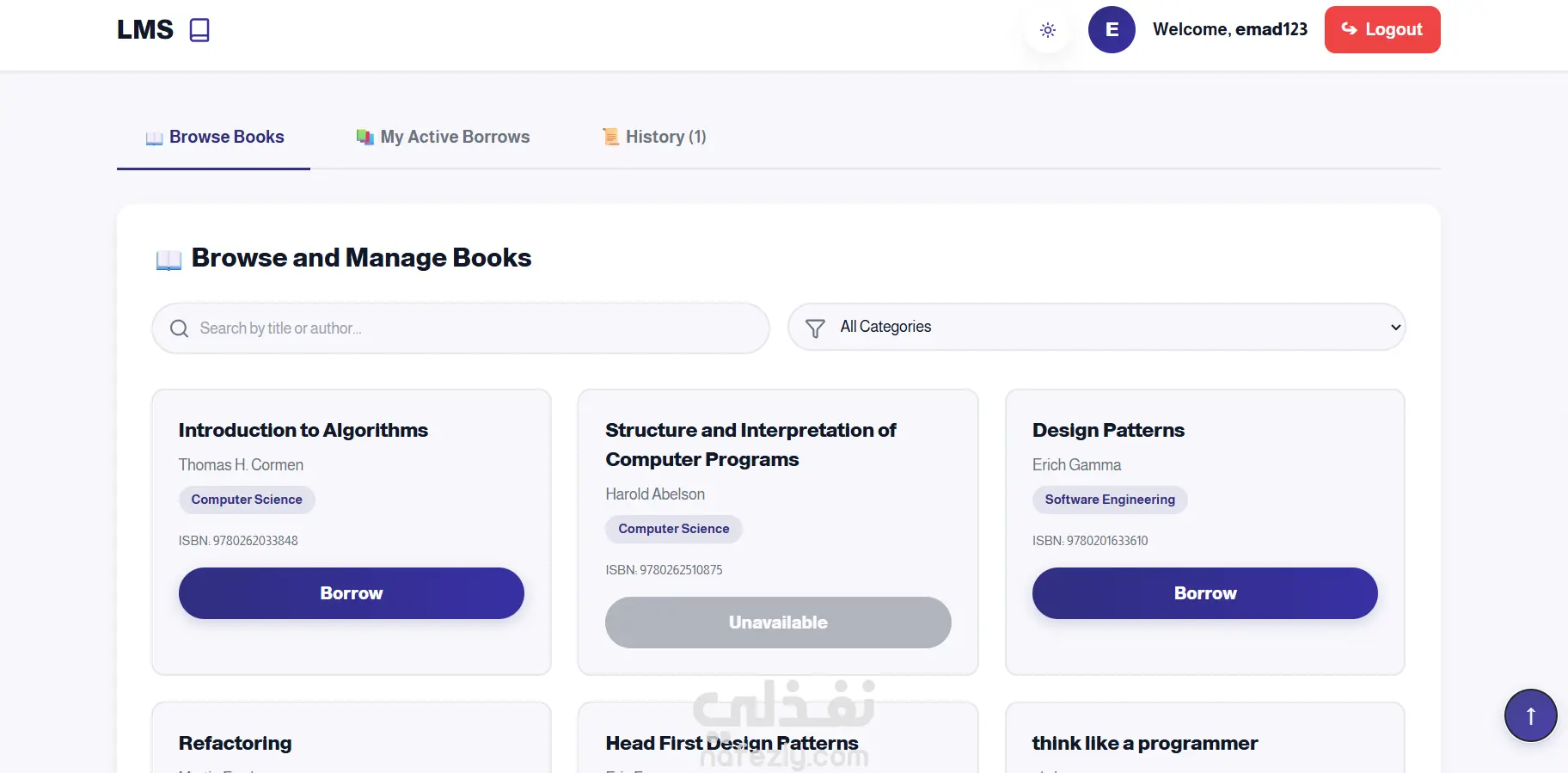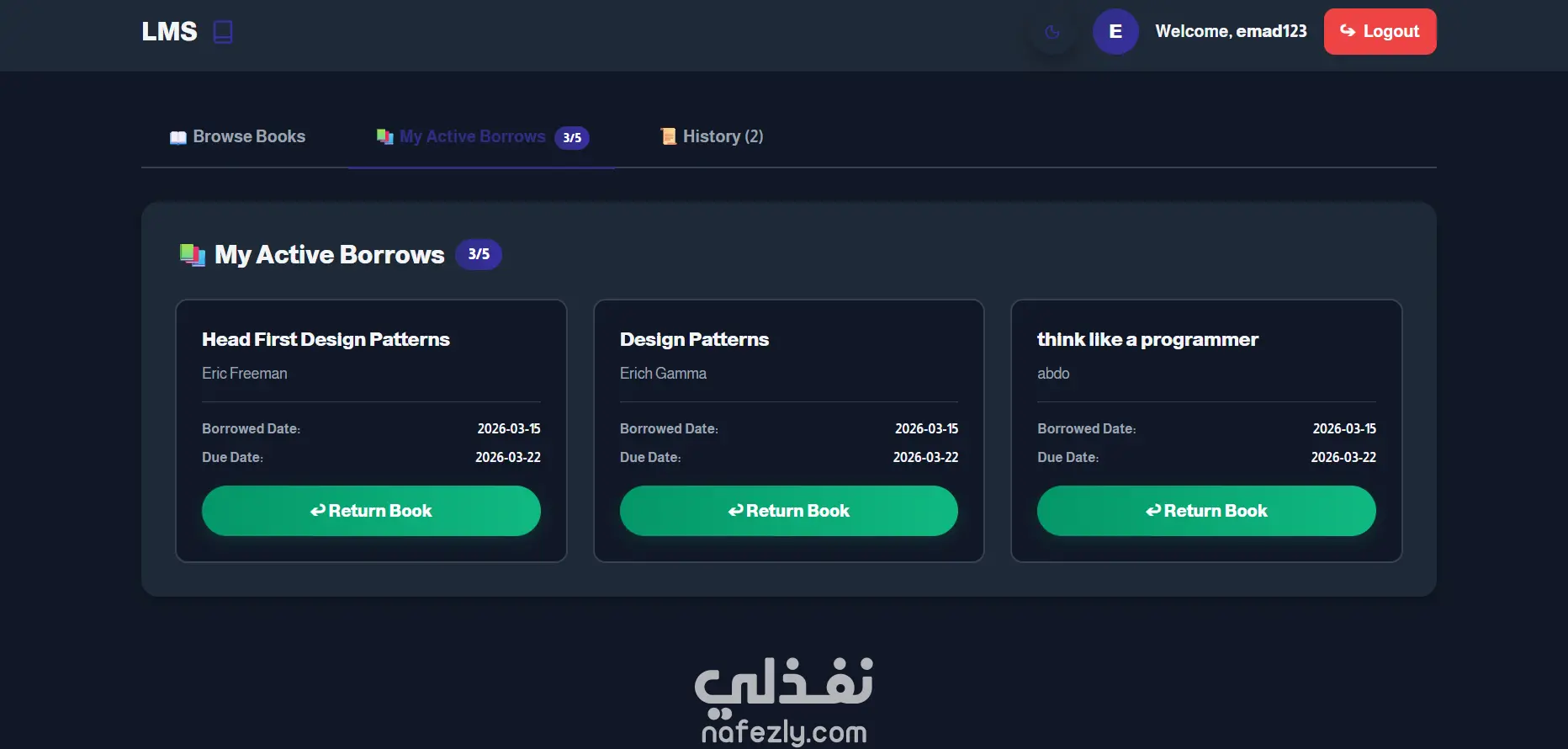 قمت بتطوير نظام ويب لإدارة المكتبات يتيح للمستخدمين تصفح الكتب واستعارتها واسترجاعها بسهولة من خلال واجهة استخدام حديثة.