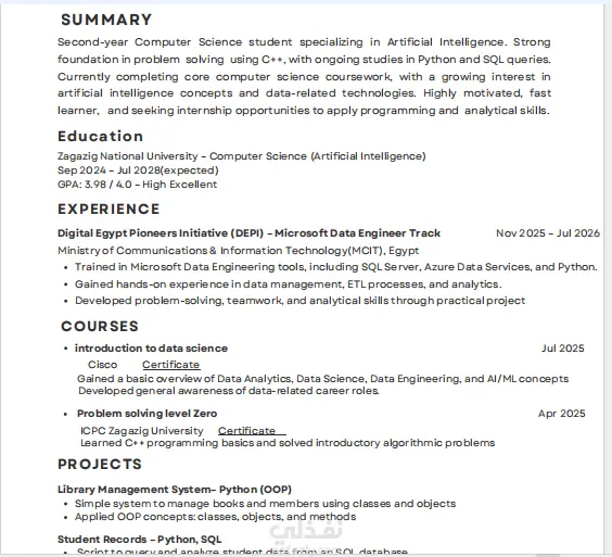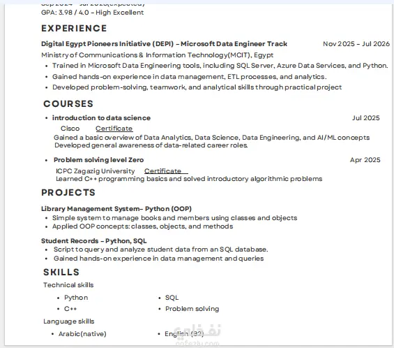 تصميم سيرة ذاتية احترافية وعصرية متوافقة مع أنظمة تتبع المتقدمين (ATS)، وهي الأنظمة التي تستخدمها الشركات لفرز السير الذاتية تلقائيًا قبل وصولها إلى مسؤول التوظيف. تم تصميم الـCV بأسلوب بسيط ومنظم يضمن قراءة المعلومات بسهولة سواء بواسطة أنظمة ATS أو من قبل مسؤولي التوظيف. مميزات التصميم: تصميم متوافق مع أنظمة ATS. تنظيم واضح للأقسام الأساسية (الخبرات – التعليم – المهارات). استخدام خطوط بسيطة قابلة للقراءة. تصميم احترافي مناسب للتقديم على مختلف الوظائف. قابل للتعديل وإضافة المعلومات بسهولة. الأدوات المستخدمة: Microsoft Word / Canva