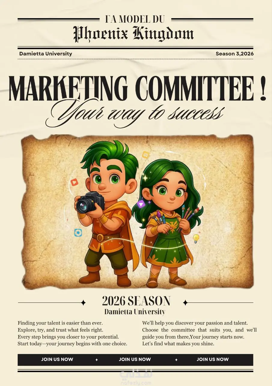 تصميم إبداعي يدمج بين كلاسيكية الصحف القديمة (Vintage Newspaper) وحيوية الرسوم الكرتونية، صُمم خصيصاً للتسويق للجنة الطلابية بجامعة دمياط (Season 3).