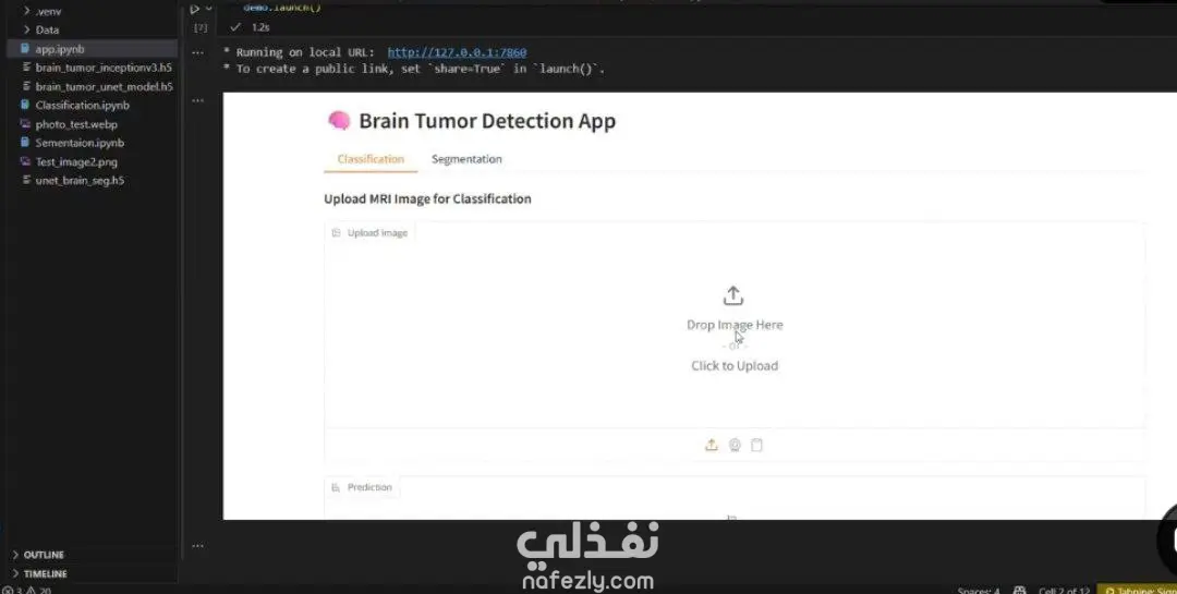 هذا المشروع هو عبارة عن تطبيق ويب تفاعلي يعتمد على تقنيات الذكاء الاصطناعي (AI) لمساعدة المتخصصين في تحليل صور الرنين المغناطيسي (MRI). يتميز النظام بالقدرة على تنفيذ مهمتين أساسيتين: التصنيف (Classification): تحديد ما إذا كانت الصورة تحتوي على ورم أم لا، وتحديد نوعه باستخدام نموذج InceptionV3. التجزئة (Segmentation): تحديد مكان الورم بدقة داخل صورة الدماغ ورسم حدود حوله باستخدام نموذج U-Net المتطور. طريقة التنفيذ: تم بناء النماذج البرمجية باستخدام مكتبات TensorFlow و Keras. تم تطوير واجهة المستخدم باستخدام إطار عمل Gradio لتوفير تجربة مستخدم سلسة تسمح برفع الصور والحصول على النتائج فوراً. استخدام بيئة Jupyter Notebook (داخل VS Code) لإدارة البيانات وتدريب النماذج.