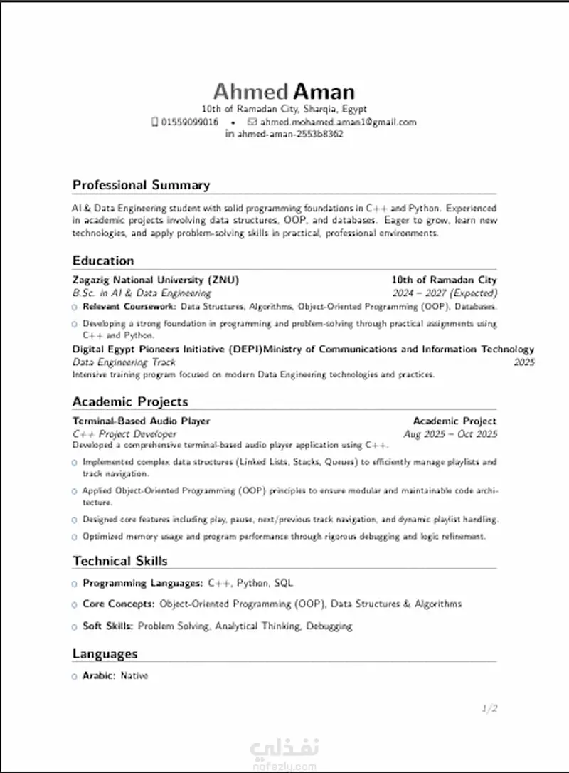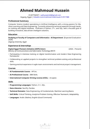 أقدم لك خدمة متكاملة لكتابة وتصميم سيرة ذاتية احترافية تعكس مهاراتك وخبراتك بأسلوب جذاب ومنظم يناسب سوق العمل. ماذا ستحصل عليه؟ كتابة محتوى السيرة الذاتية بصياغة احترافية تصميم أنيق ومنظم باستخدام Microsoft Word التسليم بصيغتين: Word و PDF مناسبة لجميع المجالات والتخصصات وقت التسليم: يوم واحد فقط