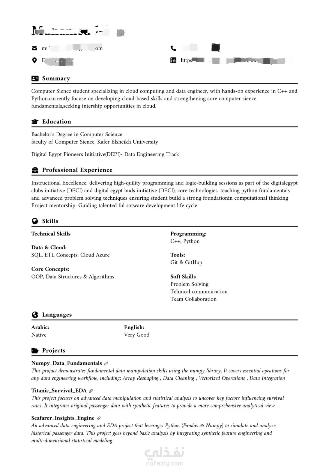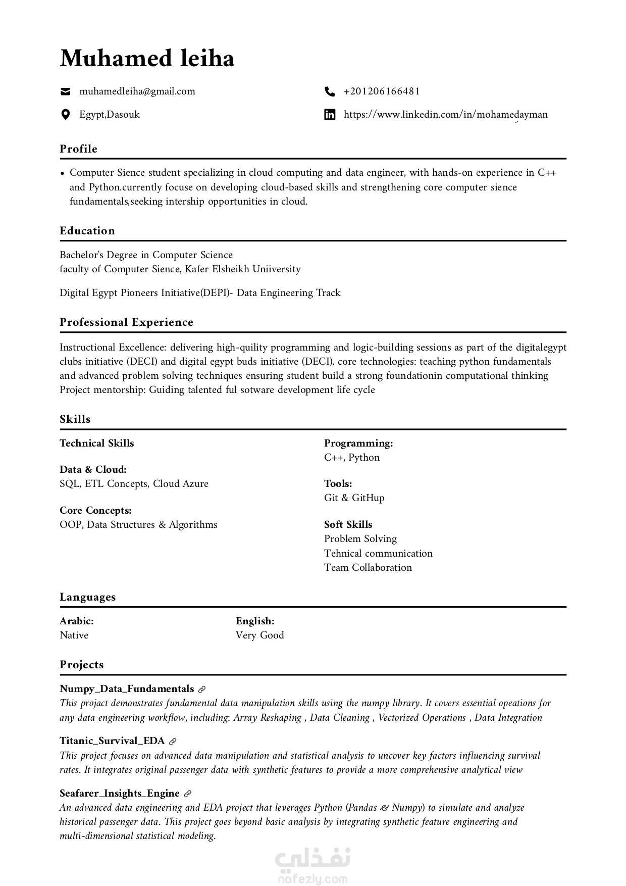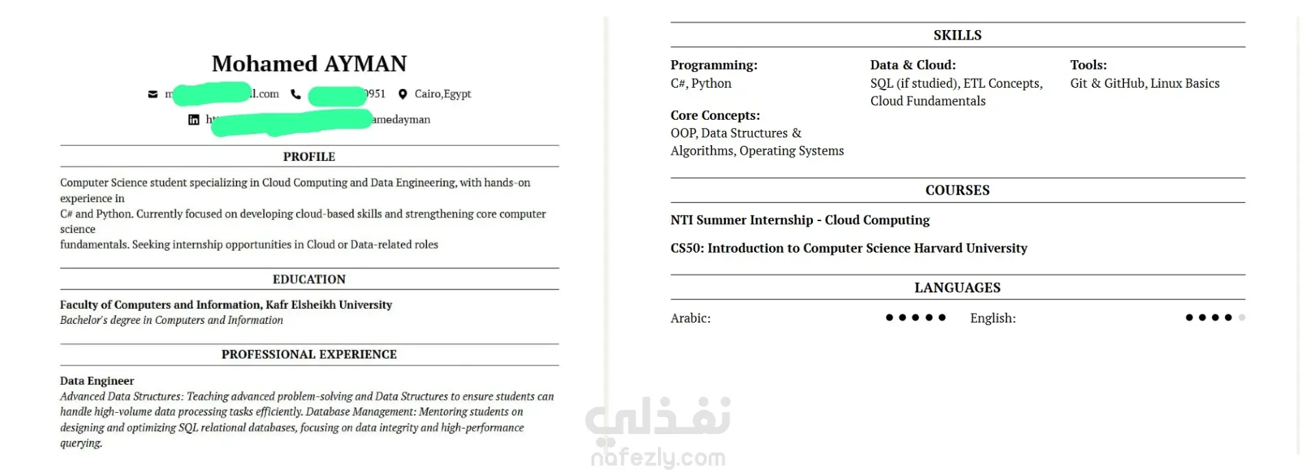 أقدم خدمة كتابة وتطوير السير الذاتية بأسلوب احترافى يجمع بين التنسيق البصرى الجذاب والمحتوى التقني الدقيق، مع التركيز على جعل السيرة الذاتية متوافقة مع أنظمة الفرز الآلي (ATS).
