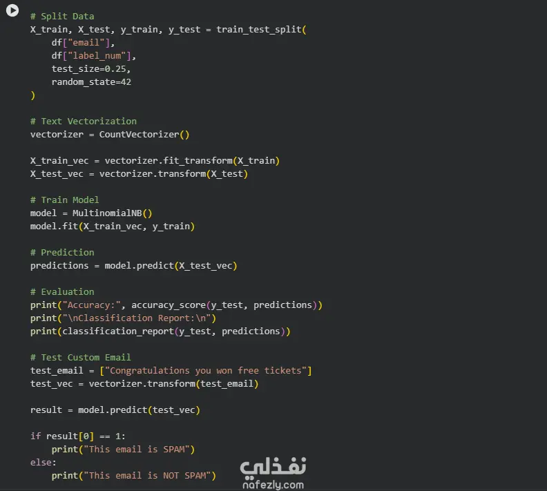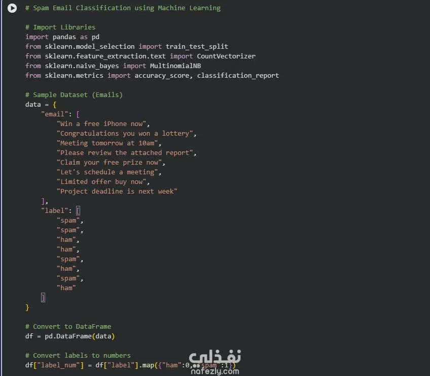 في هذا المشروع قمت ببناء نموذج بسيط لتصنيف رسائل البريد الإلكتروني إلى رسائل مزعجة (Spam) أو غير مزعجة باستخدام خوارزميات تعلم الآلة. يشمل المشروع معالجة النصوص واستخراج الخصائص من البيانات النصية ثم تدريب نموذج تصنيف باستخدام مكتبة Scikit-learn.