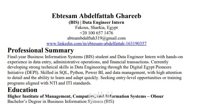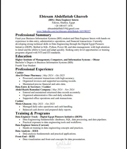 خدمة إعداد سيرة ذاتية احترافية متوافقة مع أنظمة ATS هل ترغب في سيرة ذاتية احترافية تزيد فرص قبولك في الوظائف؟ أقدم لك خدمة إعداد وتطوير السيرة الذاتية بطريقة احترافية متوافقة مع أنظمة تتبع المتقدمين (ATS) التي تستخدمها الشركات لفحص السير الذاتية. مميزات الخدمة: • كتابة أو إعادة صياغة السيرة الذاتية بشكل احترافي • تصميم CV منظم وسهل القراءة • توافق السيرة الذاتية مع أنظمة ATS المستخدمة في التوظيف • إبراز المهارات والخبرات بطريقة تجذب مسؤولي التوظيف • تنسيق احترافي وجاهز للإرسال للشركات ما الذي ستحصل عليه؟ • سيرة ذاتية احترافية بصيغة Word وPDF • تنظيم واضح للأقسام (الخبرات – المهارات – التعليم – المشاريع) • تحسين الكلمات المفتاحية لزيادة فرص ظهورك في أنظمة التوظيف مناسبة لـ: الطلاب – الخريجين الجدد – الباحثين عن عمل – الراغبين في تطوير سيرتهم الذاتية. إذا كان لديك سيرة ذاتية قديمة يمكنني تحسينها وتطويرها لتصبح أكثر احترافية.