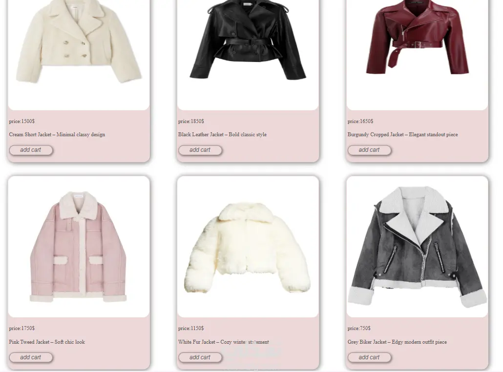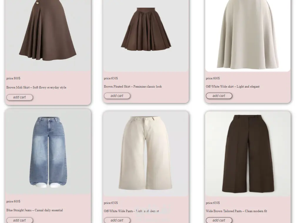 تعرض مجموعة من الملابس مثل الجيب والبناطيل والجواكت، مع تصميم واضح يساعد المستخدم على مشاهدة المنتجات بسهولة والتعرف على أشكالها.