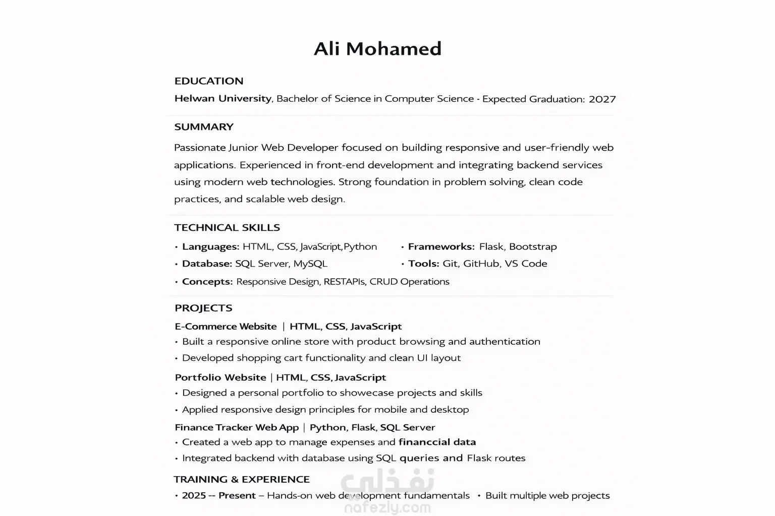قمت بإعداد وتصميم سيرة ذاتية احترافية لمطور ويب مبتدئ (Junior Web Developer) بهدف إبراز المهارات التقنية والمشاريع البرمجية بطريقة واضحة ومنظمة تساعد على جذب انتباه مسؤولي التوظيف في مجال تطوير الويب.