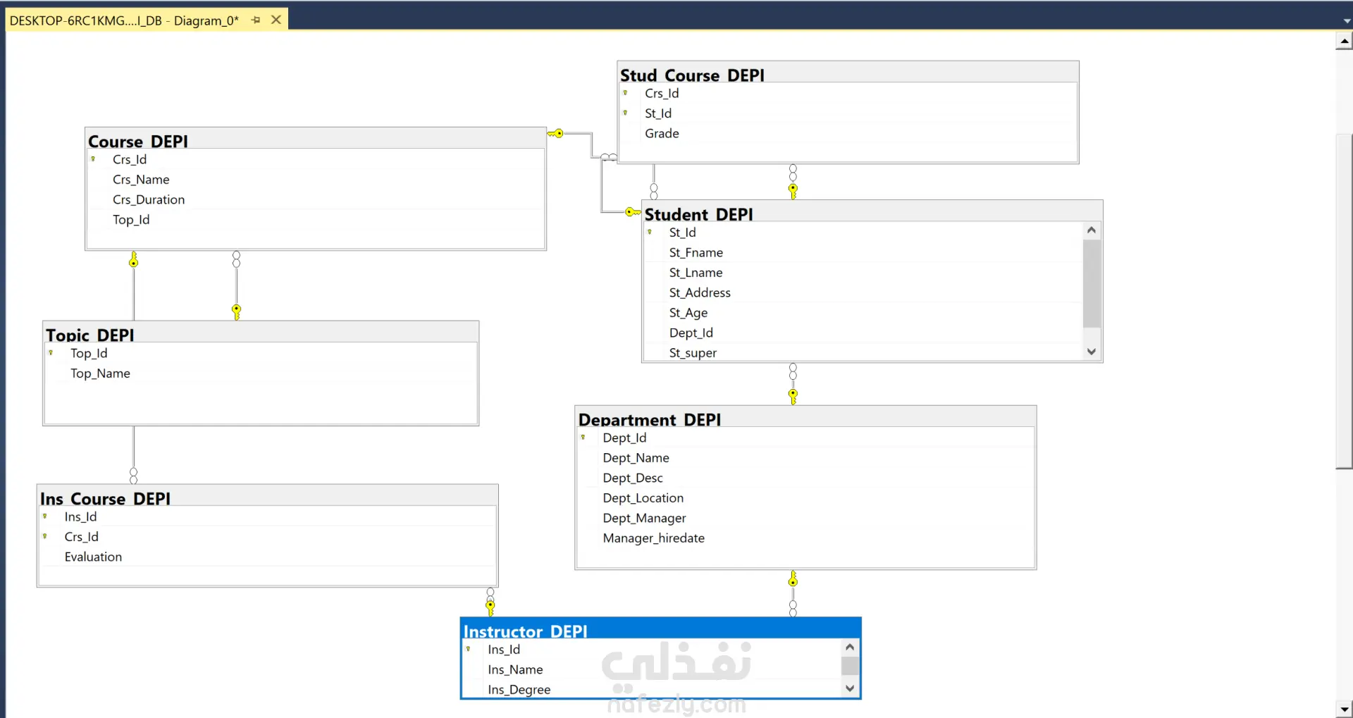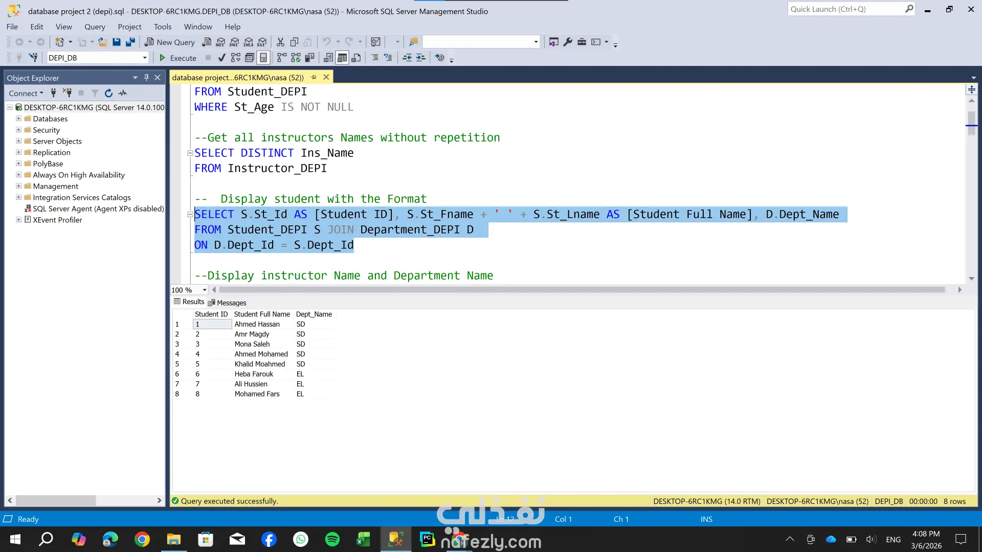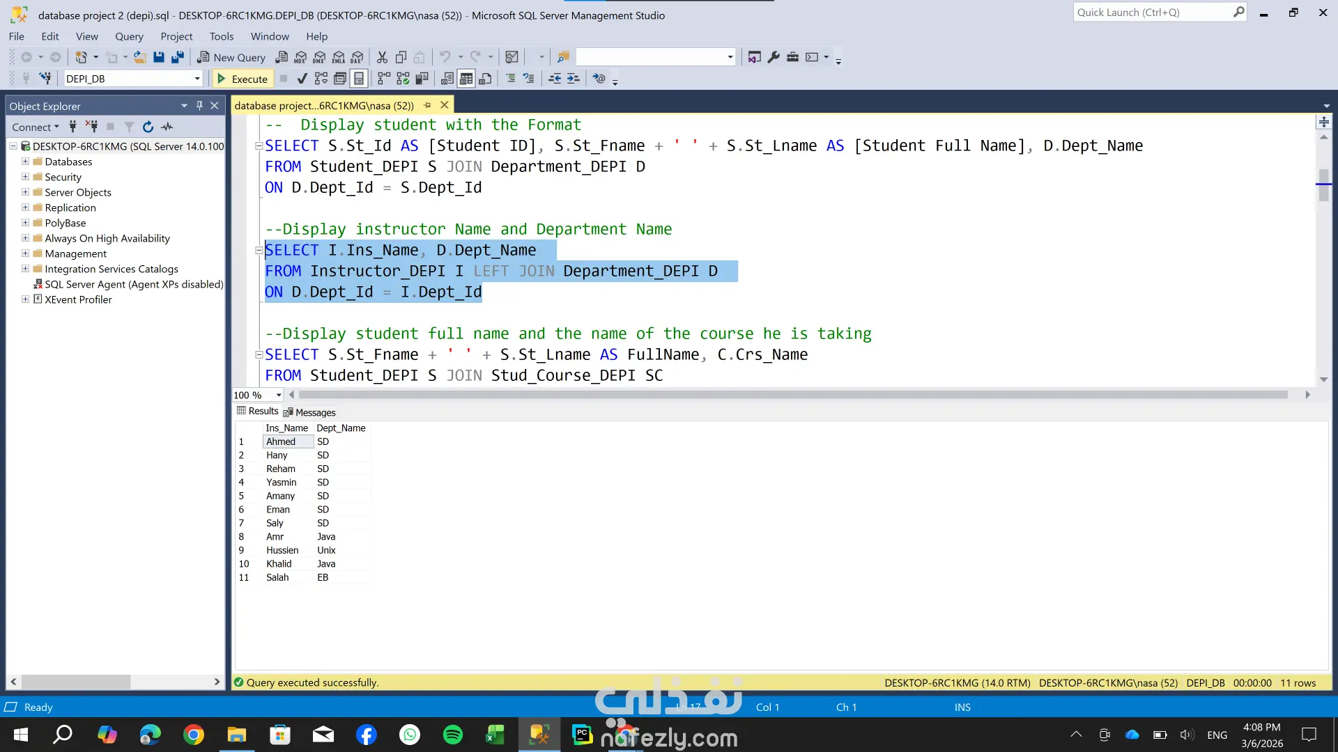 تصميم وهيكلة قاعدة بيانات شاملة لإدارة نظام تعليمي (طلاب، كورسات، أقسام) ، مع التركيز على بناء علاقات منطقية تضمن سلامة البيانات وسهولة استرجاعها. المهام التي قمت بها : 1- تحليل المتطلبات: تحديد الكيانات الأساسية مثل الطلاب، المدرسين، الكورسات، والأقسام. 2- تصميم الـ ER Diagram: رسم مخطط علاقات الكيانات لتحديد نوع العلاقة بين كل جدول والآخر . 3- تعريف المفاتيح : إعداد المفاتيح الأساسية والمفاتيح الخارجية لربط الجداول ببعضها بدقة. 4- تجهيز البيانات للتحليل: قمت بتصميم الجداول بشكل يسهل عملية الربط لاستخراج تقارير تحليلية دقيقة حول أداء الطلاب والكورسات.