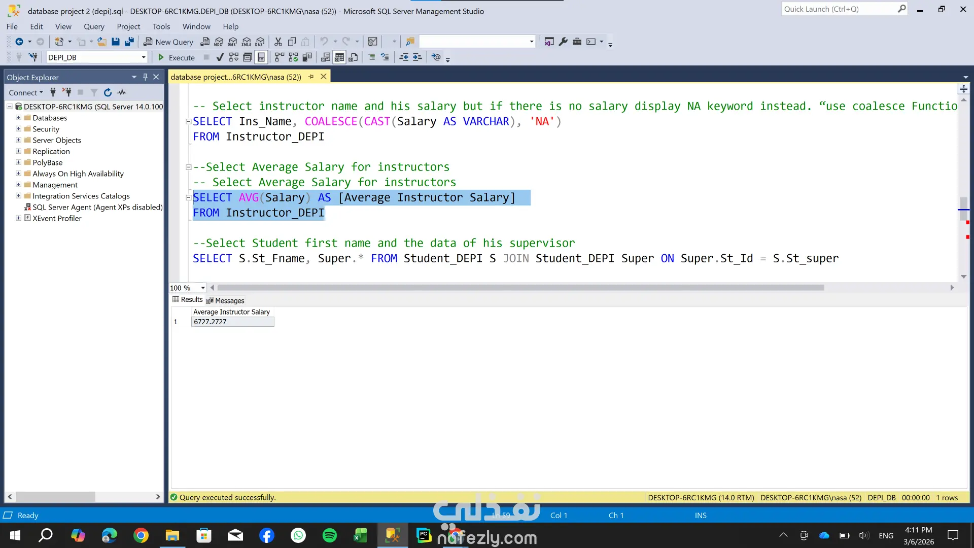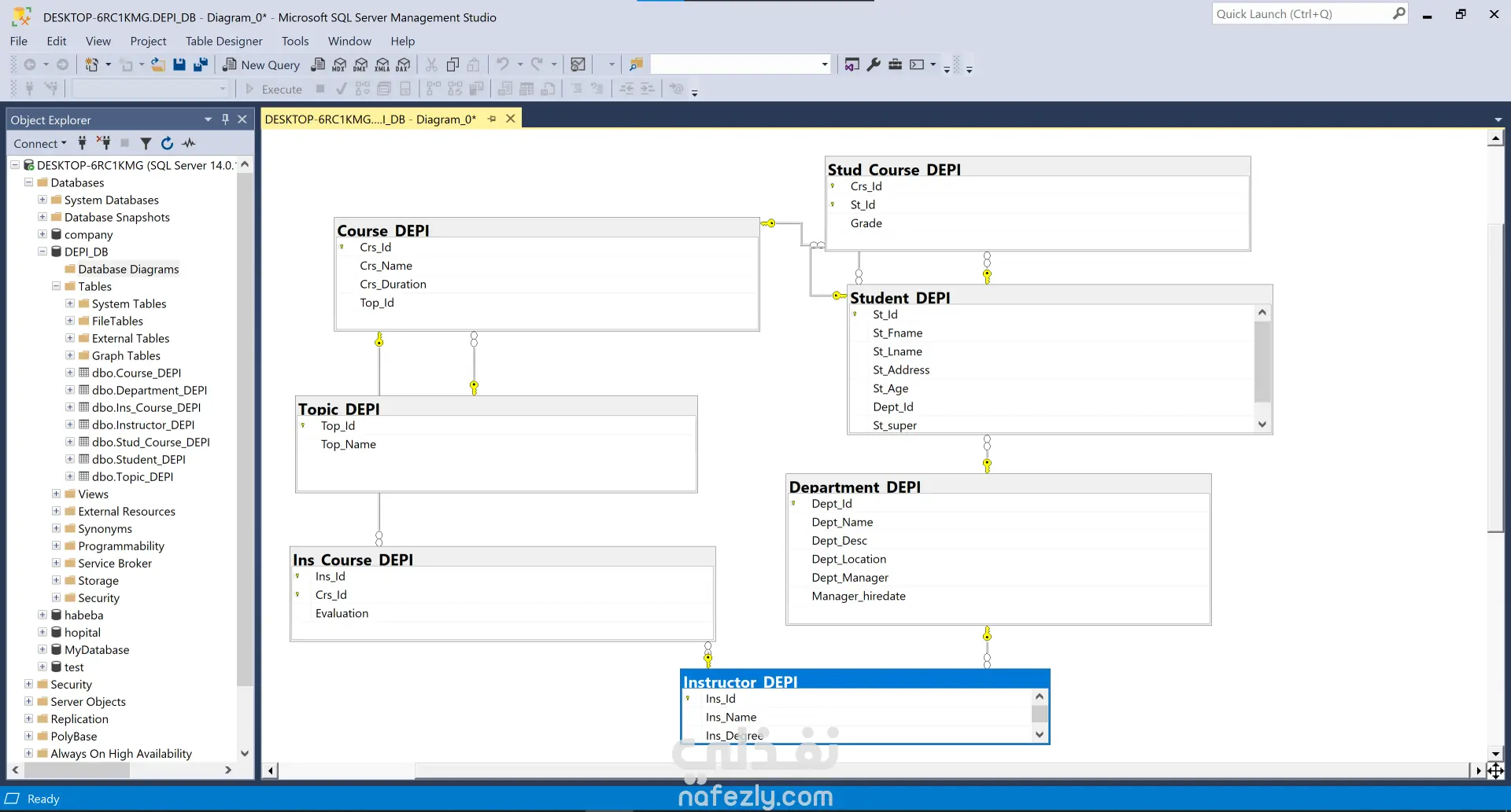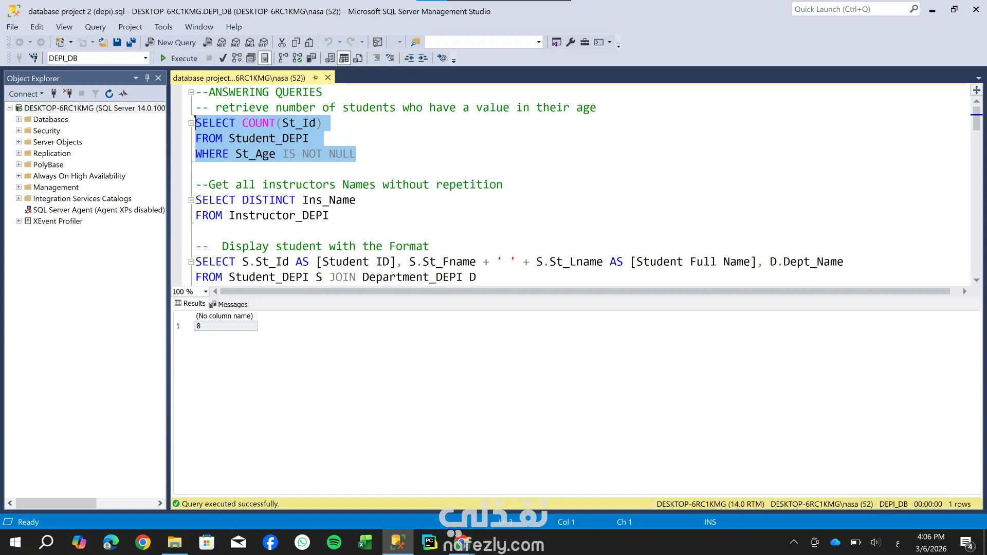 تصميم وهيكلة قاعدة بيانات شاملة لإدارة نظام تعليمي (طلاب، كورسات، أقسام) ، مع التركيز على بناء علاقات منطقية تضمن سلامة البيانات وسهولة استرجاعها. المهام التي قمت بها : 1- تحليل المتطلبات: تحديد الكيانات الأساسية مثل الطلاب، المدرسين، الكورسات، والأقسام. 2- تصميم الـ ER Diagram: رسم مخطط علاقات الكيانات لتحديد نوع العلاقة بين كل جدول والآخر . 3- تعريف المفاتيح : إعداد المفاتيح الأساسية والمفاتيح الخارجية لربط الجداول ببعضها بدقة. 4- تجهيز البيانات للتحليل: قمت بتصميم الجداول بشكل يسهل عملية الربط لاستخراج تقارير تحليلية دقيقة حول أداء الطلاب والكورسات.