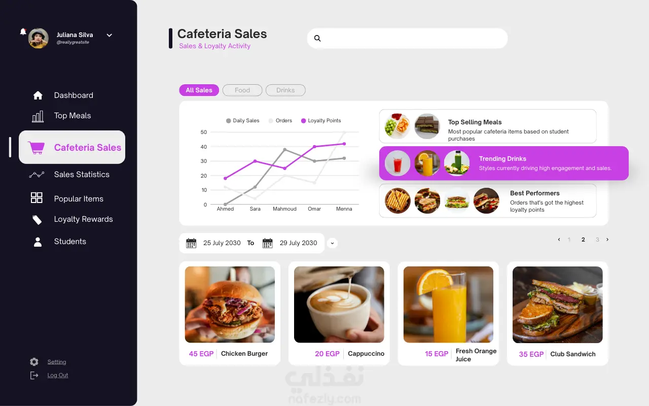 قمت بتطوير نظام إدارة كافيتريا متكامل يحتوي على نظام نقاط ولاء مبني على قاعدة بيانات لإدارة المنتجات، بيانات الطلاب، والمشتريات. يقوم النظام بحساب نقاط الولاء تلقائيًا بحيث يحصل الطالب على نقطتين مقابل كل 10 جنيهات يتم إنفاقها، مع إمكانية استبدال النقاط بمكافآت (20 نقطة = خصم 5 جنيهات).
