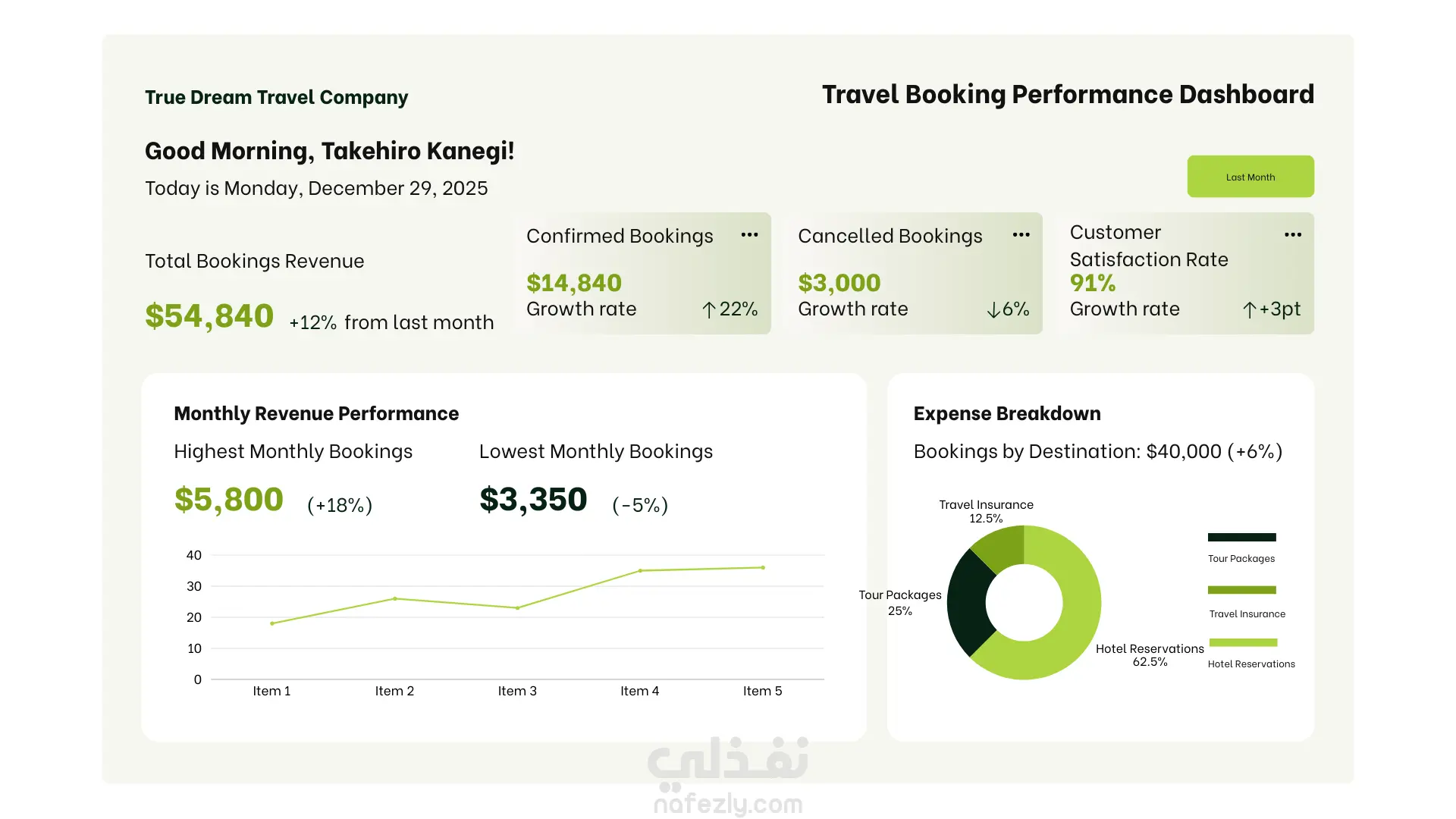 قمت بتصميم وتطوير قاعدة بيانات مخصصة لشركة True Dream Travel Company، مع بناء العلاقات بين البيانات والـ Key Maps لتنظيم وربط بيانات الشركة بشكل فعّال. كما أنشأت لوحة معلومات تفاعلية لمتابعة مؤشرات الأداء الرئيسية (KPIs) مثل الحجوزات، الإلغاءات، والإيرادات، مما ساعد على تحسين وضوح البيانات ودعم اتخاذ القرار.